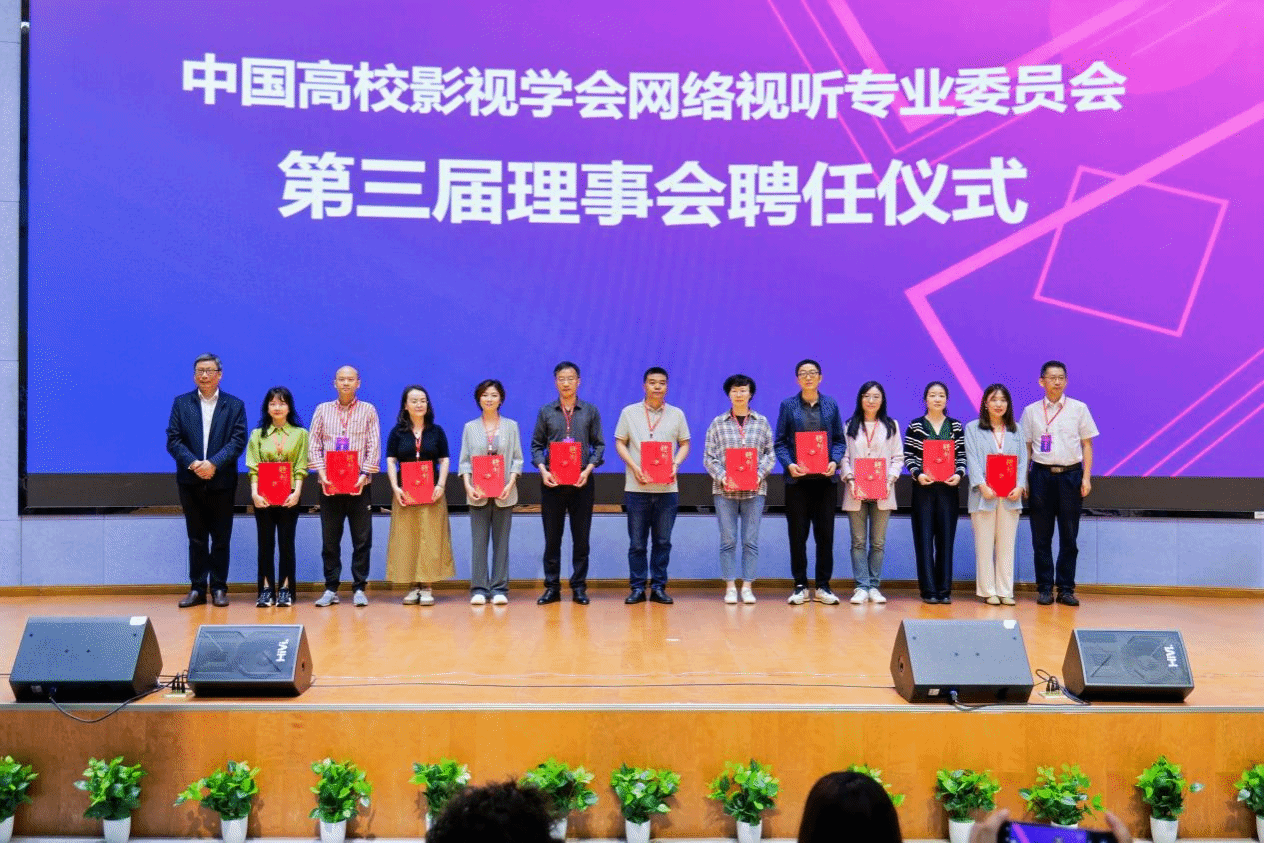 中国高校影视学会副会长兼秘书长、中国传媒大学出版社副社长张国涛研究员宣读《中国高校影视学会网络视听专业委员会第三届理事会成立批复文件》。孟建当选名誉主任,王方当选主任委员,张智华、刘荃、刘涛、罗思、程樯、邱章红、顾亚奇、赵晖当选副主任委员;许波当选秘书长,张陆园当选副秘书长;别君红等45人当选新一届理事会理事。张国涛研究员等分别为网络视听专业委员会第三届理事会管理班子成员和理事颁发了聘书。