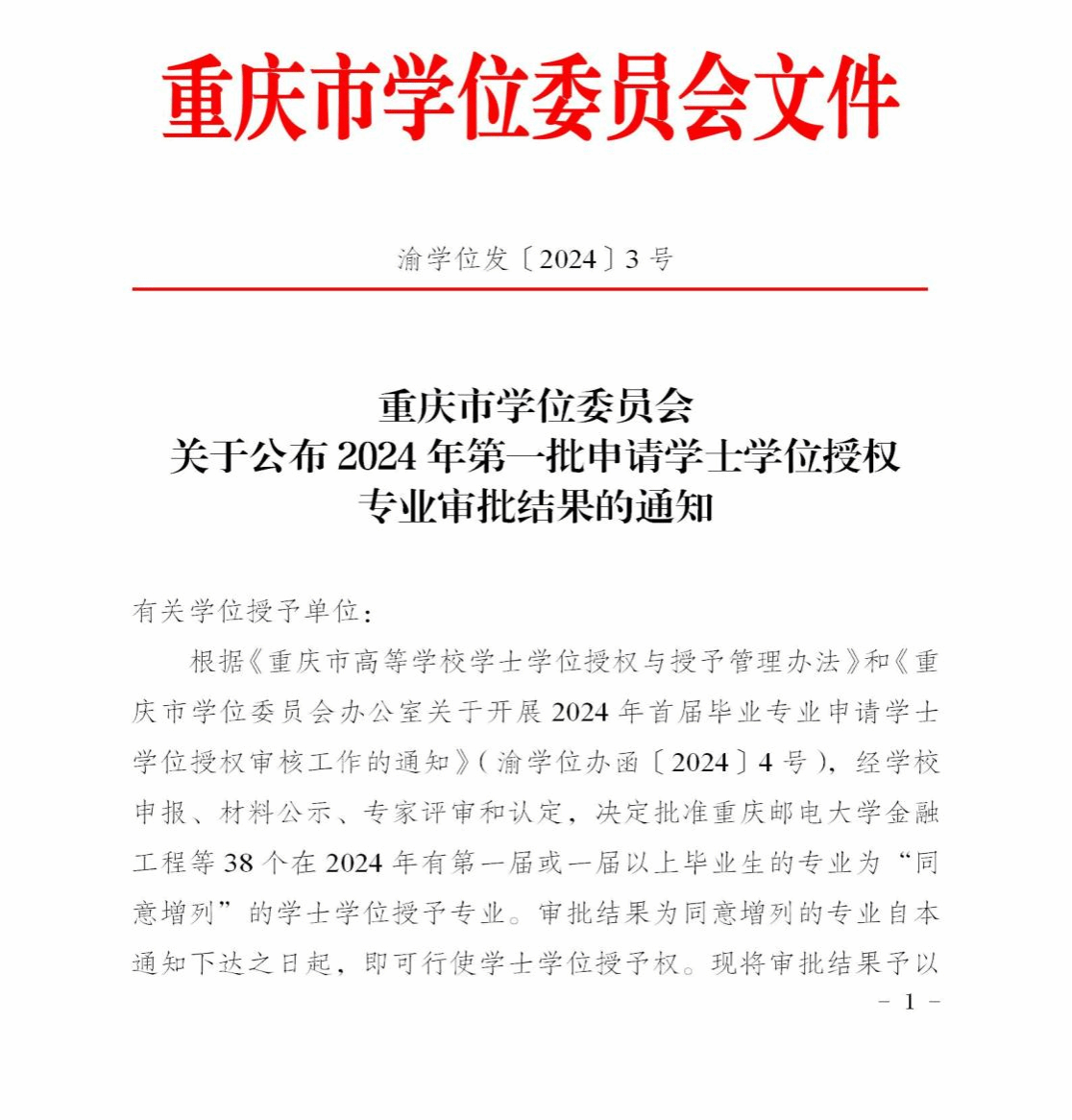 近日,根据《重庆市学位委员会关于公布2024年第一批申请学士学位授权专业审批结果的通知》(渝学位发〔2024〕3号),36365官网网络与新媒体、学前教育和应用统计学3个专业被同意增列为学士学位授予专业。