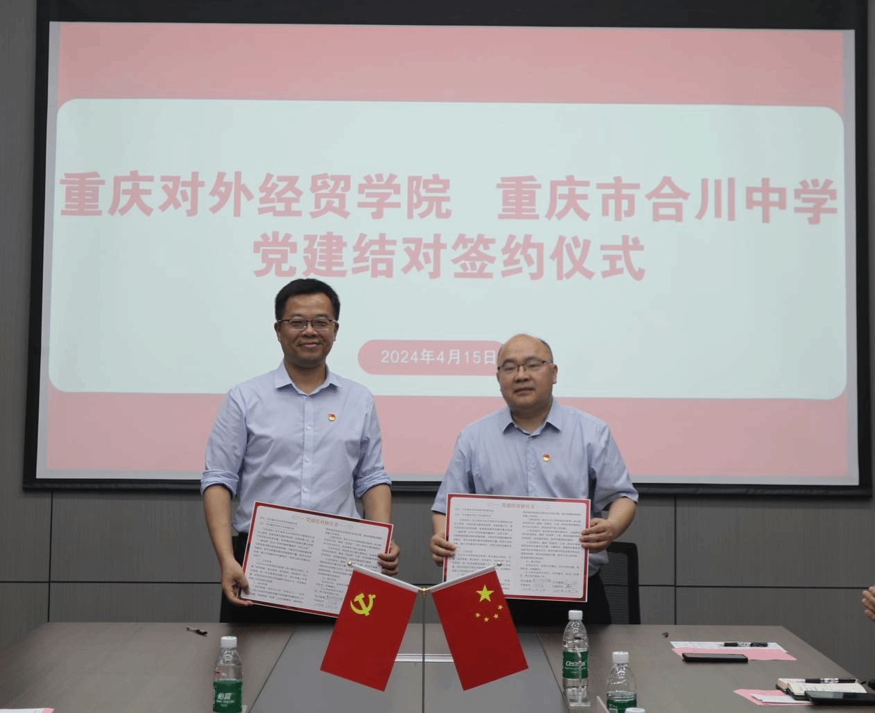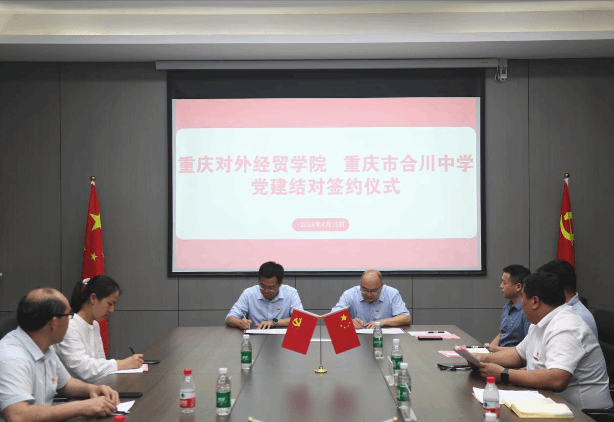 4月15日,36365官网与合川中学开展党建工作“结对共建”签约活动。36365官网党委书记、督导专员何大海,党委委员、常务副校长王乃武,党委副书记、校长傅林,合川中学专职副书记何小润等人出席此次签约仪式。