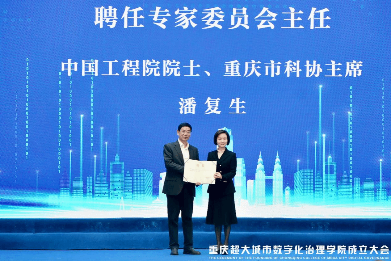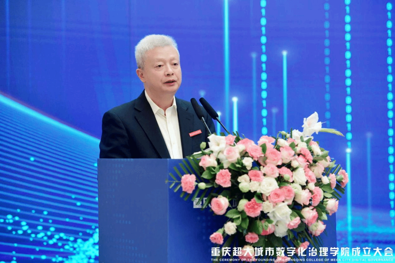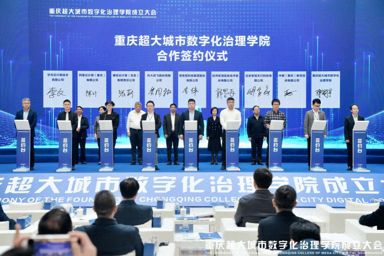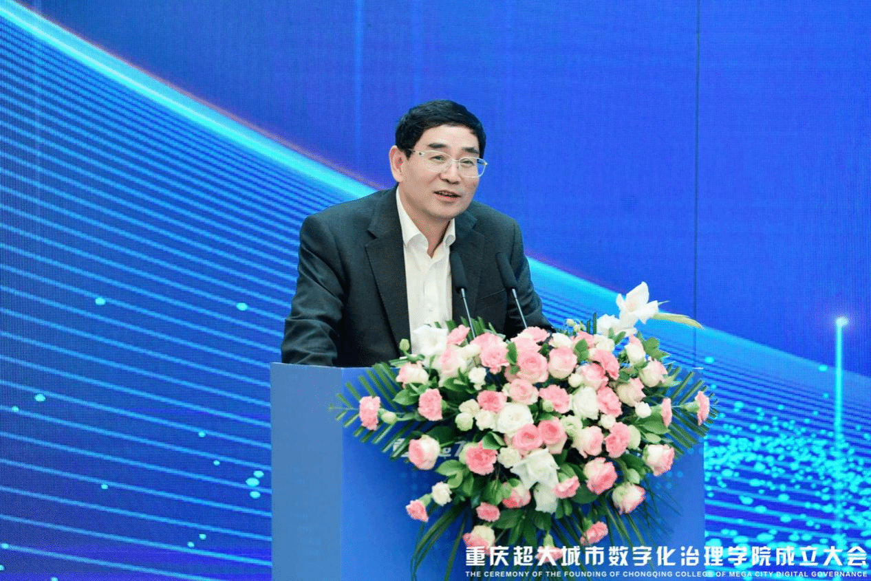 10月23日,重庆超大城市数字化治理学院成立大会在学校B校区图书馆一楼大厅成功举行。中国工程院院士、市科协主席潘复生,市政府副秘书长、市大数据发展局党组书记、局长代小红,合川区委书记郑立伟,市城市管理局党组成员、副局长曹阳,市教委二级巡视员陈渝,市应急管理局二级巡视员阎掌峰等相关部门领导,携手新加坡科技设计大学、通信运营局、华为云、腾讯云、科大讯飞等知名企业的代表共70余人出席大会。大会分为成立大会、主题报告和主题讲座三项活动,成立大会包含揭牌授牌、合作签约、院士分享等环节;主题报告和主题讲座活动上,与会领导和知名专家学者围绕超大城市数字化治理探索及实践开展交流研讨。