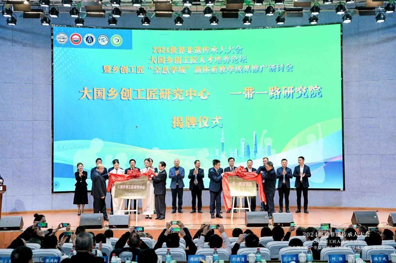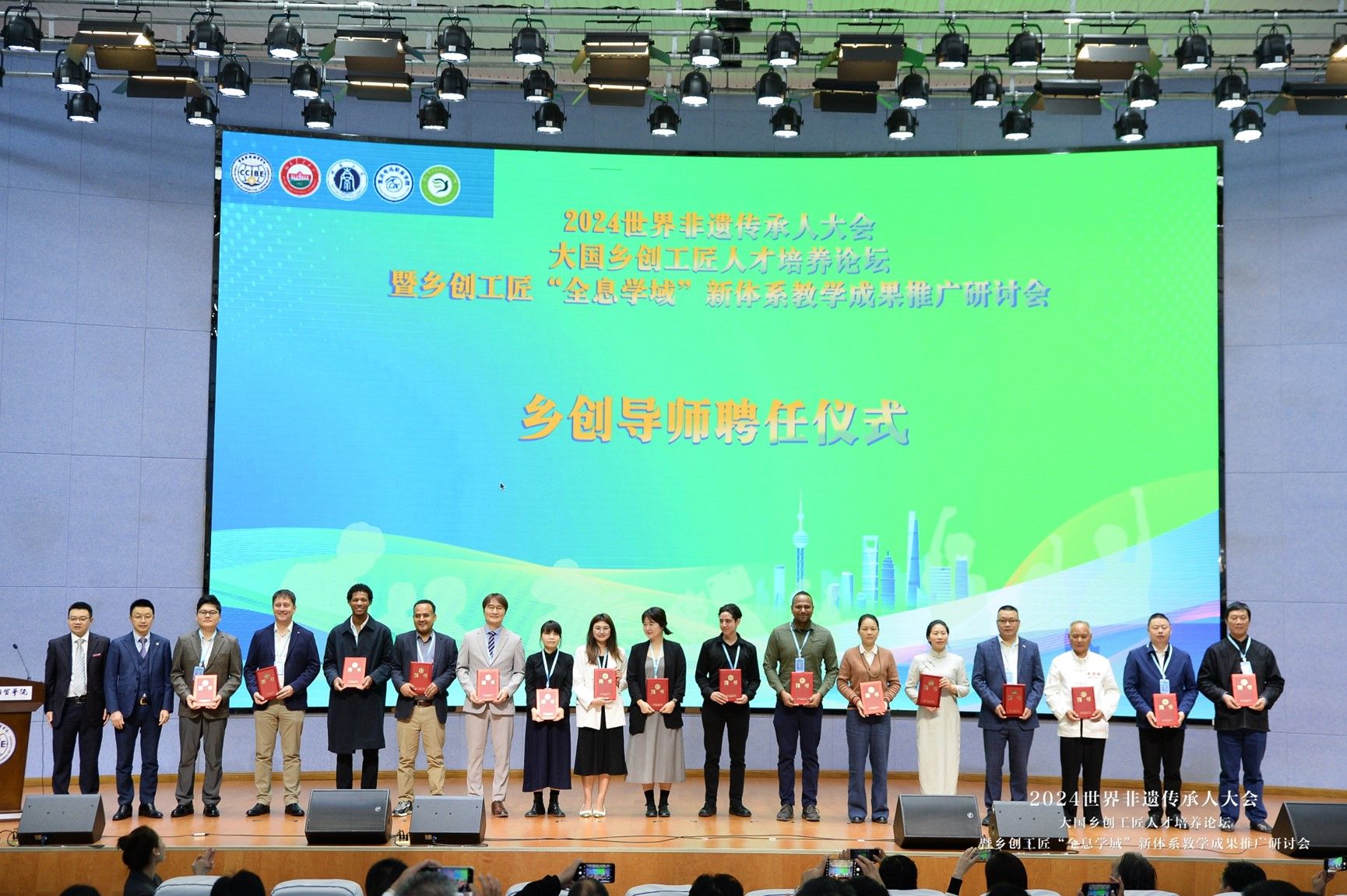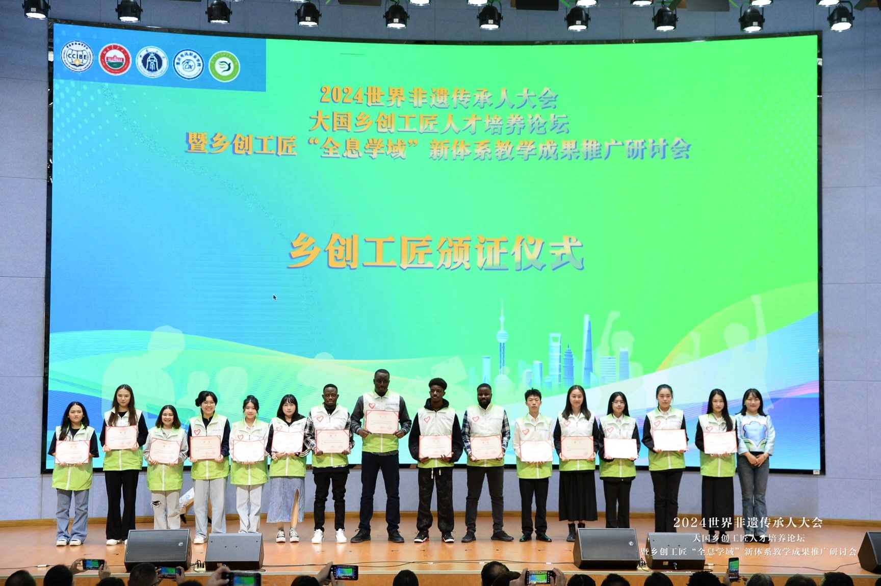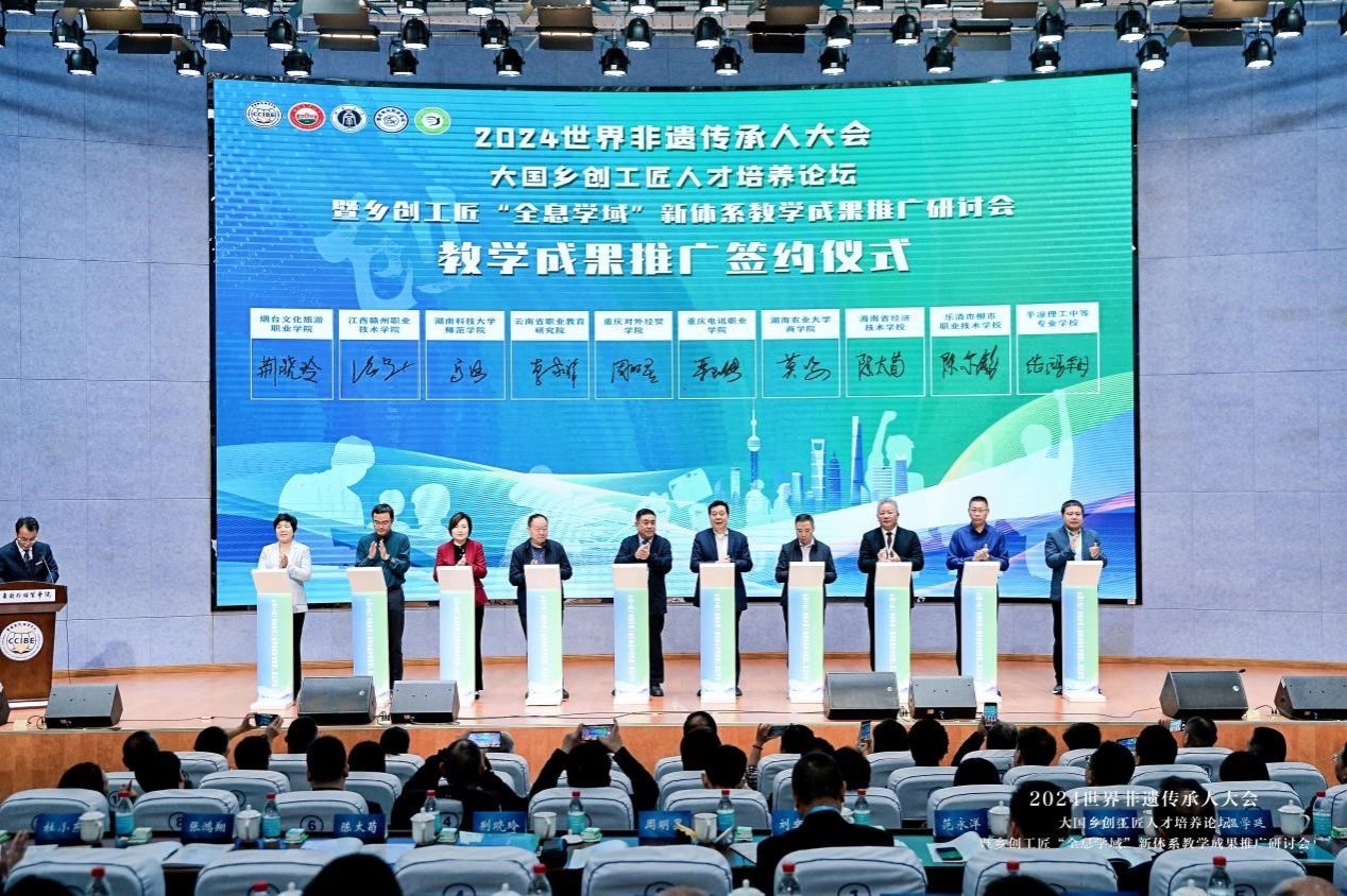 副校长周明星教授说:我们通过政行企校联合培养,历经八年的教育教学实践探索,形成的涉外乡创工匠CEO“全息学域”新体系教学成果,该成果具有全国首创性、引领性、示范性和推广性,秉持培育“终身创客”理念,形成“生源息—生产息—生成息”的“全息”路径,构建“立心领域—厚识界域—富能场域”的“学域”,铸造“在校学习—在职研习—在岗创习”的终身学习链,努力破解世界非遗传承人和乡创工匠教育培养教学难题,构建了“乡创工匠”新理论,营建了“产创共生”新机制,创建了“全息学域”新体系,该成果报告还在刚刚召开的2024世界非遗大会新闻发布会上进行了典型经验宣读。