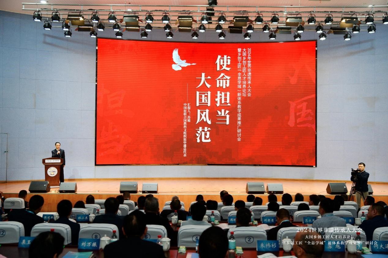 2024世界非遗传承人大会组委会主席蔡亚军先生会前表示:世界非遗传承人大会是为打造全球非遗传承人交流、互鉴的国际平台,促进非遗资源的高效配置与市场的深度融合,开拓非遗产业链,将非遗与现代社会价值体系融合而举办,大国乡创工匠人才培养论坛作为2024世界非遗大会系列活动将很好的为大会提供学术理论支撑。中国驻联合国教科文组织原申遗总代表苏旭先生在大会致辞中,通过分享自己在联合国教科文组织任职期间成功地为我国申报了33个“人类非遗名录”项目的经验,强调了教育对世界非遗传承和培养大国乡创工匠的重要性,他指出学校打造的乡创工匠“全息学域”新体系将为国内外有关高校提供很好的教育教学借鉴意义和价值。