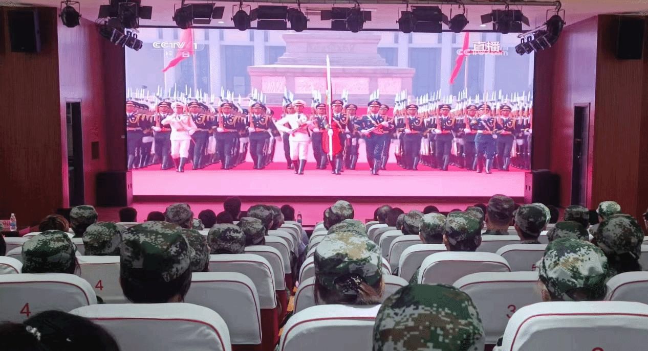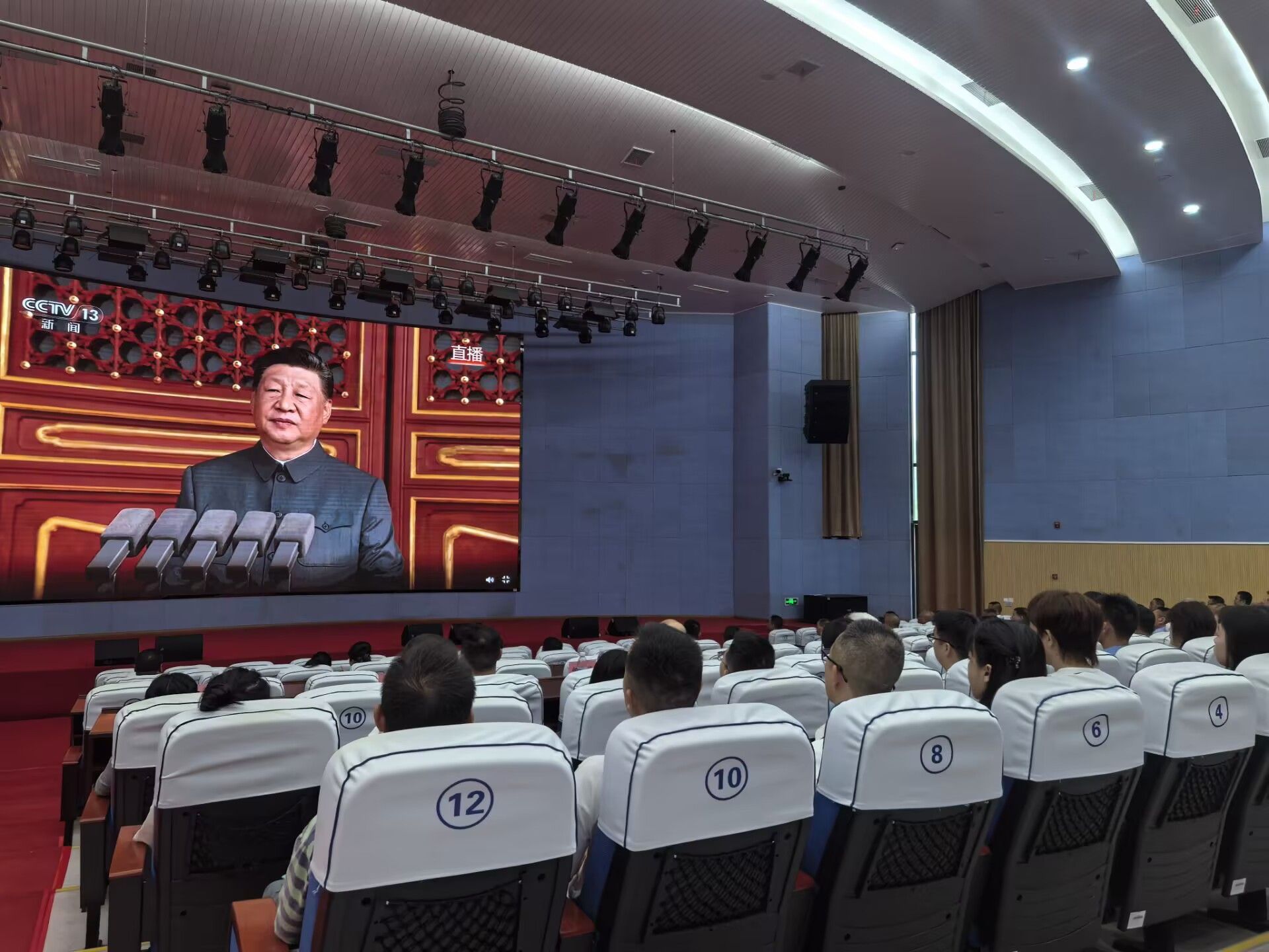 上午9时,学校组织全体校领导、在校干部和教职工、全体安保人员等在合川A校区9101报告厅集中观看大会。同时在铜梁校区寰经礼堂设立会场,组织校区干部职工及部分新生代表,集中收看阅兵直播,将爱国主义教育与新学期启航紧密融合,让红色基因浸润师生心灵,让奋斗精神点燃办学热忱,为新学期爱国主义“第一课”写下厚重的家国篇章。