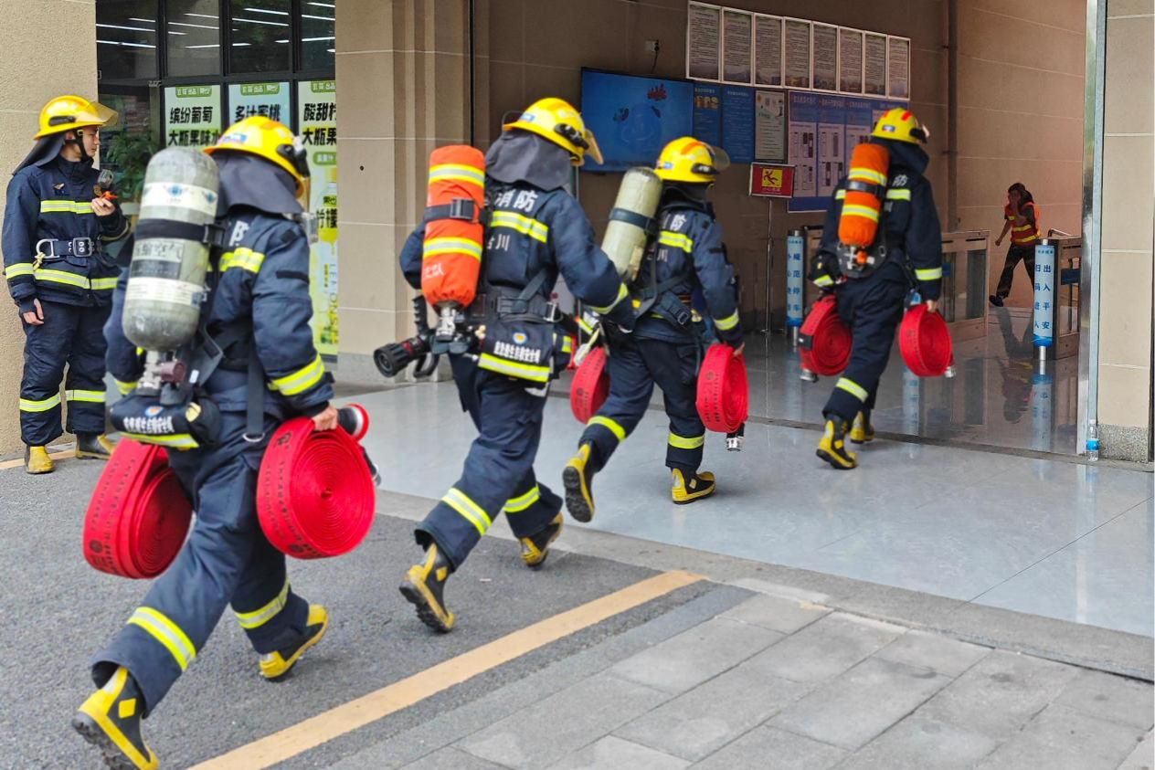 B校区消防疏散演练现场,消防员接到警情后迅速行动
