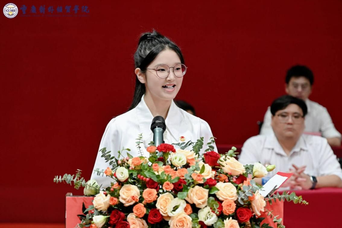 音乐舞蹈学院2023级学生莫洋博代表高年级学生发言,希望同学们在实践中提升综合能力,传承贸院优良学风。