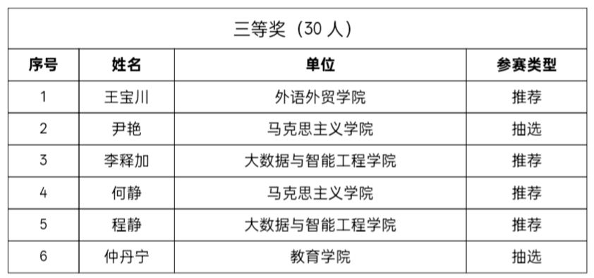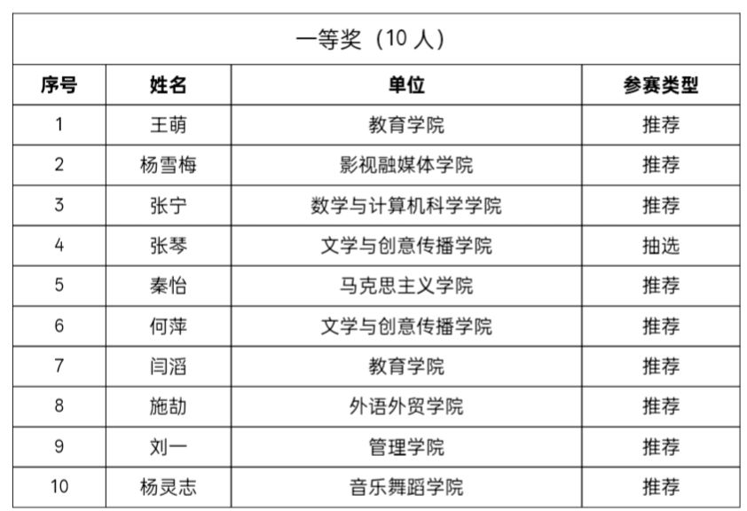 大赛评选出一等奖10名、二等奖22名、三等奖30名。其中,王萌、杨雪梅、张宁、张琴、秦怡、何萍、闫滔、施劼、刘一、杨灵志等10名教师获得一等奖;杨灵志、何庆龄、罗兰、吴倩、何冠瑶等22名教师获得二等奖;王宝川、尹艳、李释加、何静、程静等30名教师获得三等奖。
