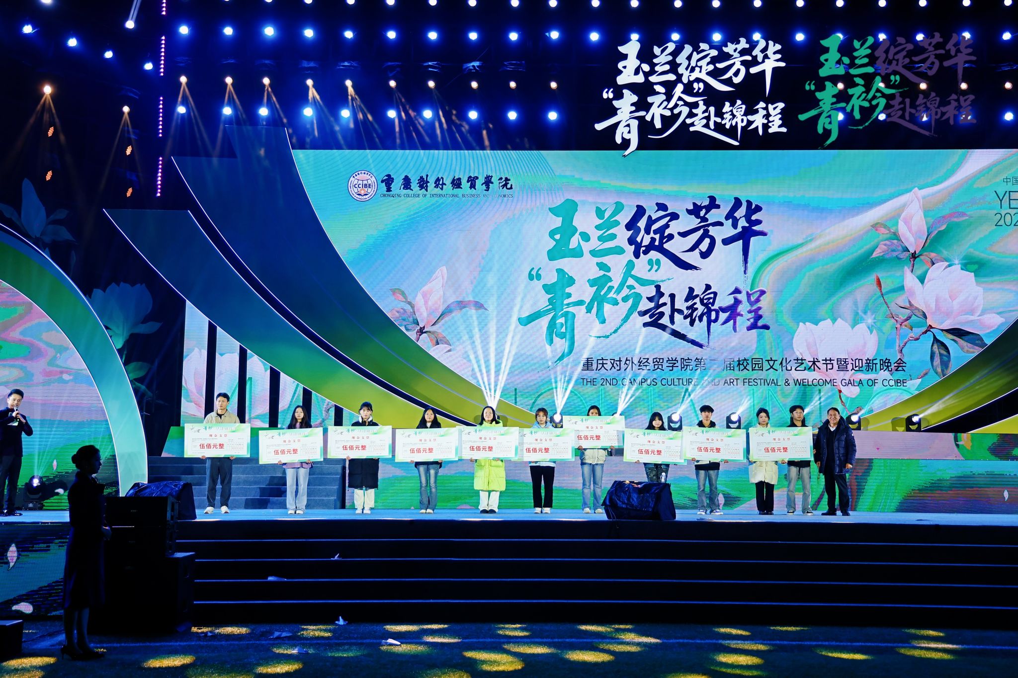11月18日晚,36365官网合川B校区田径场灯火璀璨、欢声如潮,以“玉兰绽芳华,‘青衿’赴锦程”为主题的第二届校园文化艺术节暨迎新晚会隆重举行。民建中央副主席、重庆市人大常委会副主任、民建重庆市委主委沈金强,合川区人大常委会主任徐晓强,合川区委副书记秦敏,合川区政府党组成员、副区长袁晓钦,合川区政协副主席罗杰,学校理事会理事长郭元新等领导莅临现场指导。第五中级人民法院原院长卢祖新,重庆市委宣传部二级巡视员卞明高,以及市教委、市文旅委、团市委、市文联、市歌剧院、市音协,合川区委宣传部、团区委、区文联、区文化旅游委等相关单位负责人,及区属部分中小幼学校代表受邀出席。在家校领导与各界嘉宾欢聚一堂,在初冬的暖夜里共同见证了一场集美育熏陶、文化浸润与家国情怀于一体的高水平校园文化盛宴。