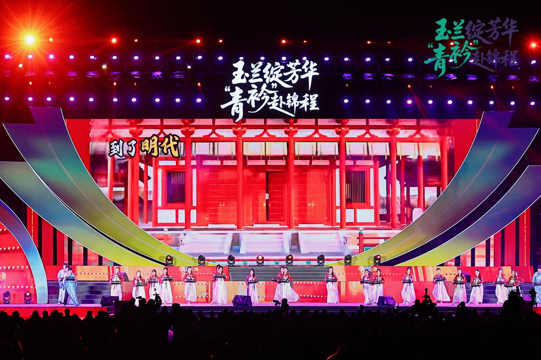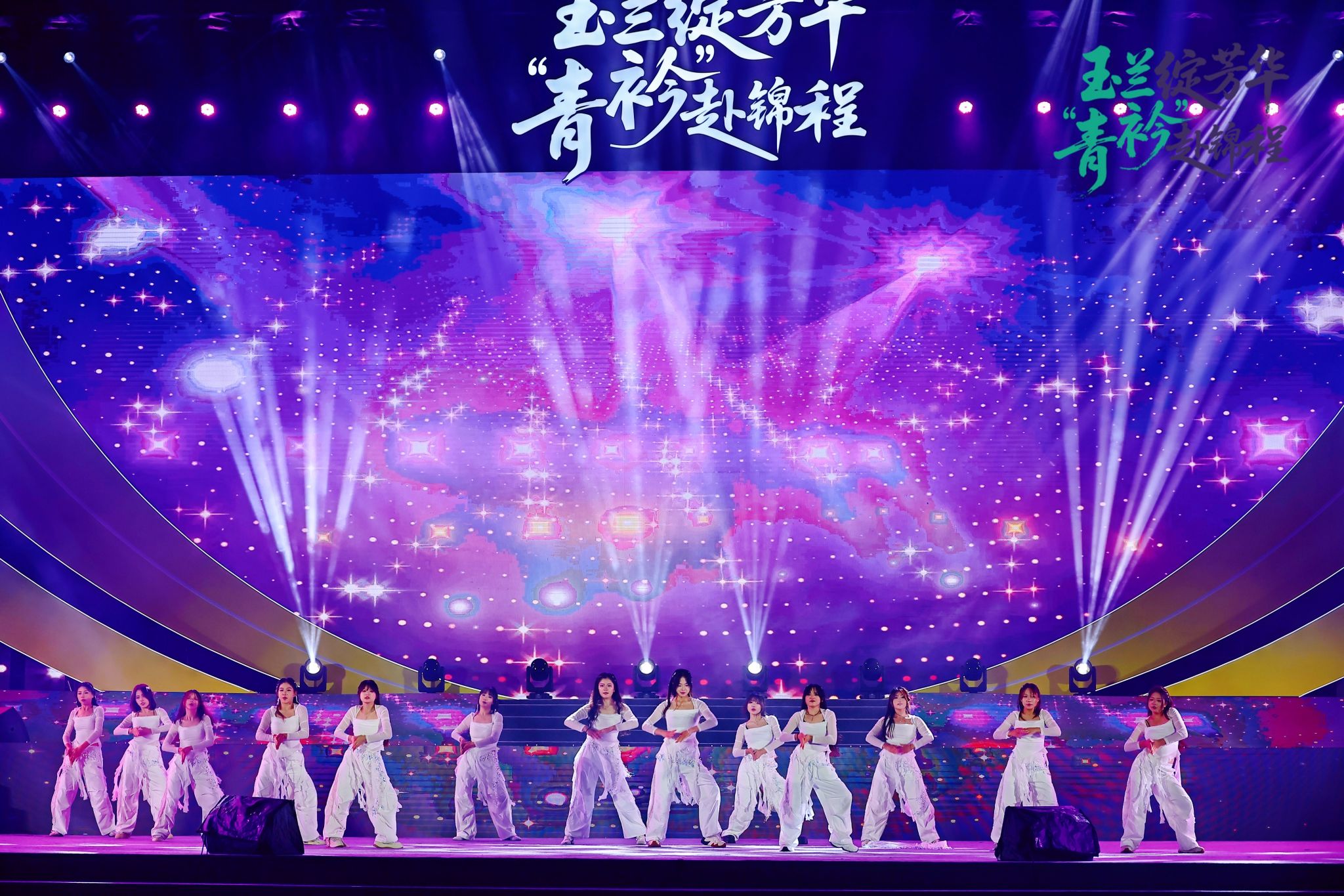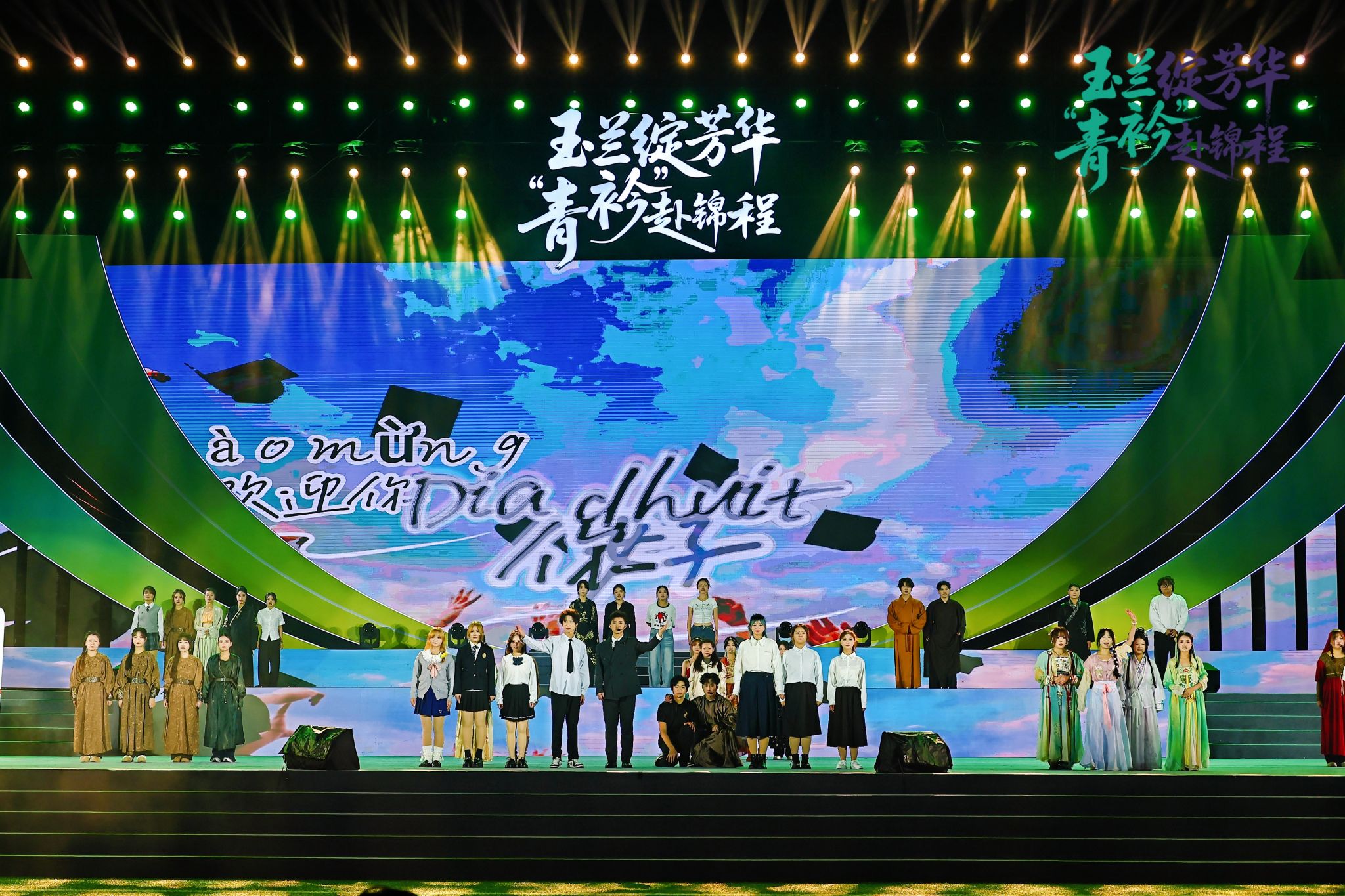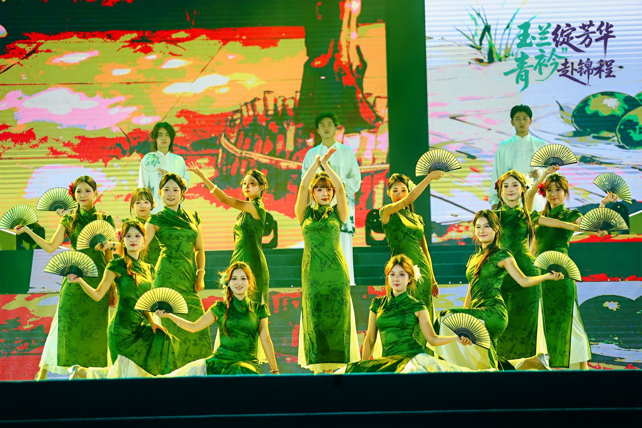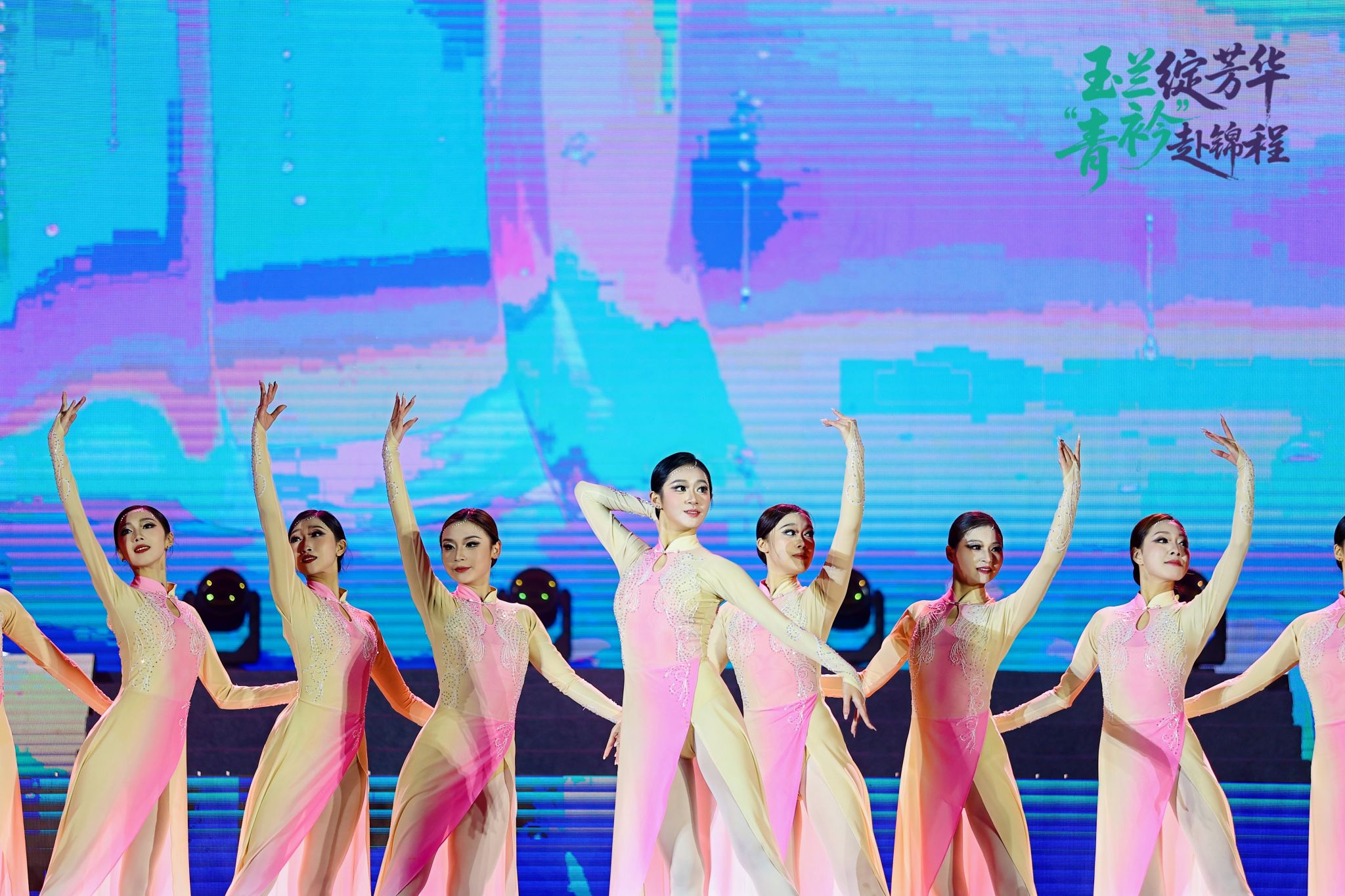 整场晚会节目立意高远、异彩纷呈,紧扣“以美育人、以文化人”核心,将美育与文化育人深度融入艺术呈现全过程。《智引未来・未来已来》《光影交织,舞动代码》以艺术形式诠释科技之美,引导学子发现跨界融合的审美价值;《伊人》《吒燃童梦,艺育未来》《数载风华》等舞蹈将古典韵味与现代舞姿相结合,实现中华优秀传统文化的创造性转化与创新性发展;走秀《黛色霜青》以服饰为媒,演绎传统美学与当代设计的碰撞,让学子感受服饰文化中的审美智慧与文化内涵;健美操《炫动星河》、舞蹈《One Spark》《共舞!我们的黄金时代!》展现青年学子阳光向上的精神风貌,传递健康美、活力美的审美理念;情景剧《丝路新语》《山河信》将家国情怀、文化传承融入剧情,在潜移默化中厚植青年学子的文化认同与使命担当。