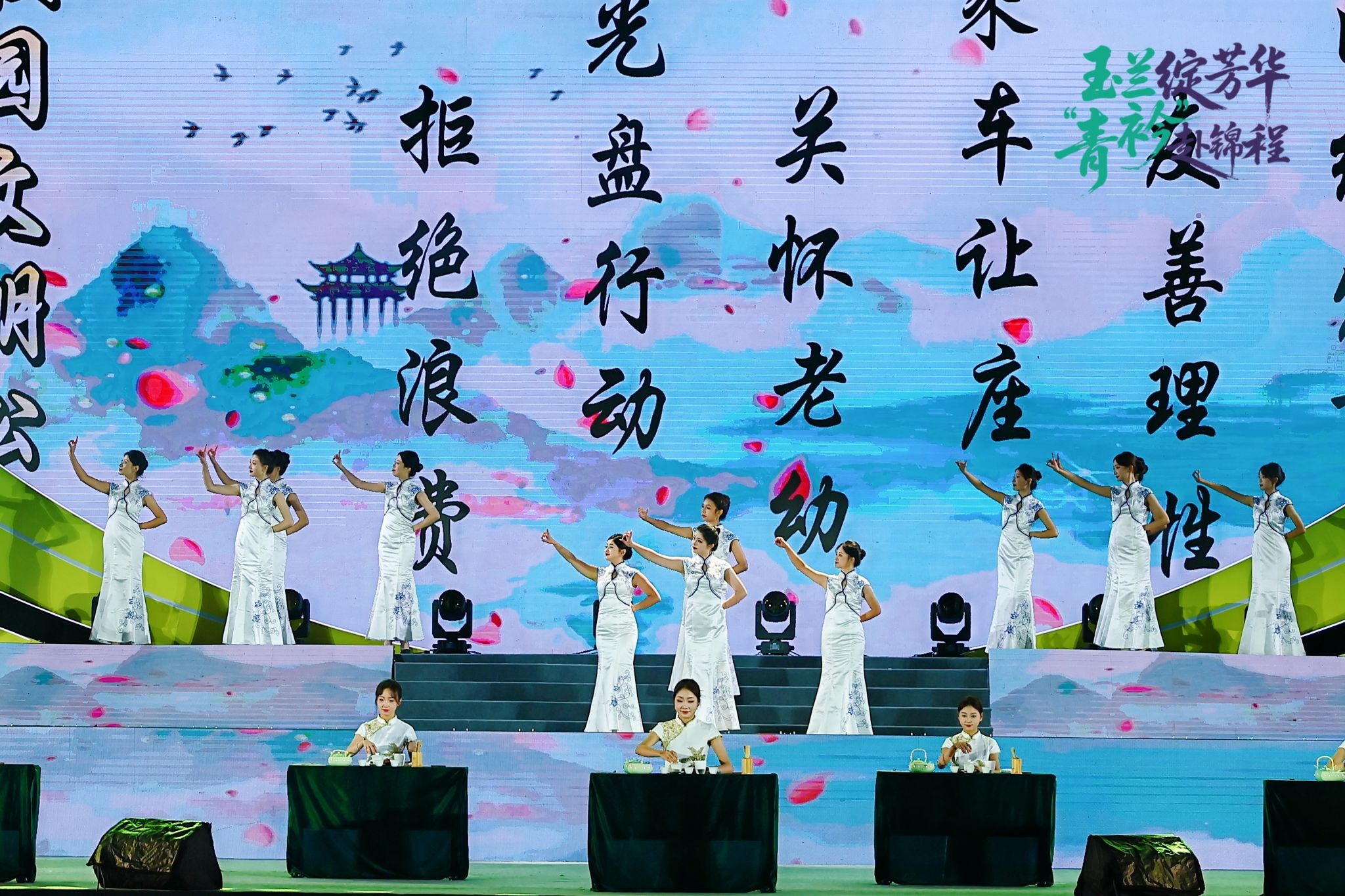 晚会伊始,校团委带来的开场舞《38 Power》以激昂的节奏、刚劲的舞步瞬间点燃全场气氛,充分展现了贸院学子蓬勃向上的青春活力与昂扬风貌。随后,信息技术中心与实验教学管理中心联袂呈现的《无人机秀》惊艳夜空,精准的编队、变幻的光影在苍穹下勾勒出科技与艺术交融的壮丽图景,让师生直观感受现代科技赋能美育的独特魅力。管理学院选送的《礼韵茶馨》以传统茶艺为载体,一招一式尽显“刚柔并济”的东方美学,在茶香雅韵中传承中华优秀传统文化的深厚底蕴,为整场晚会奠定了典雅温润的文化基调。