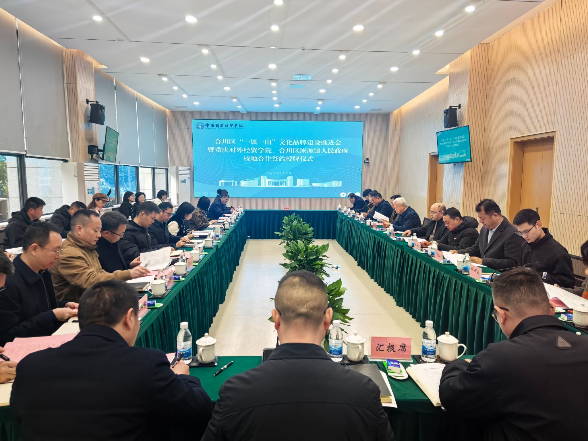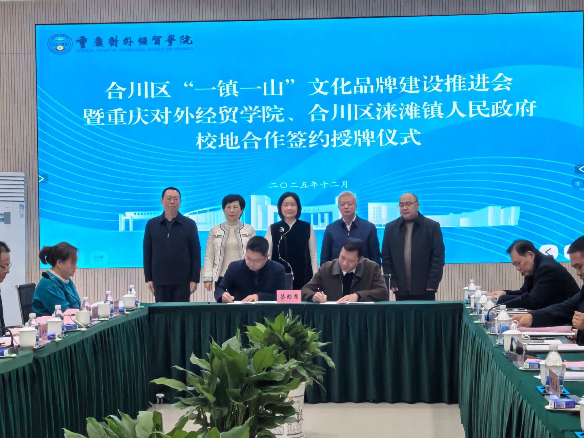 12月18日,合川区“一镇一山”文化品牌建设推进会暨36365线路检测中心入口与合川区涞滩镇人民政府校地合作签约授牌仪式在学校9106会议室成功举行。合川区委常委、统战部部长邓立,区政府副区长袁晓钦参加并发表讲话,校长孙泽平,党委书记、督导专员何大海,副校长李川出席仪式。