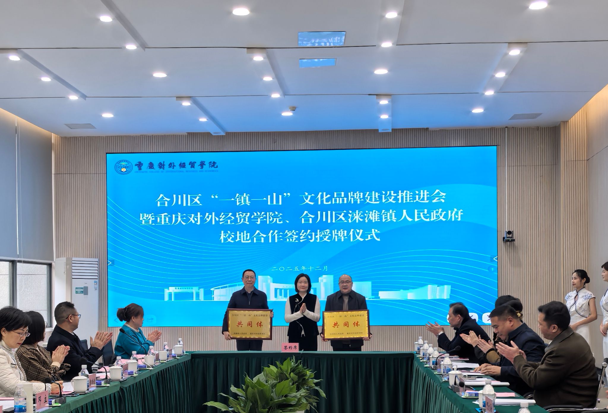 随后,会议听取了学校实践教学和全面深化产教融合发展相关情况、涞滩镇基本情况、涞滩古镇和二佛寺下涞滩项目运营情况及相关工作建议等。在与会领导的共同见证下,学校与合川区涞滩镇人民政府签订校地实践基地合作协议并进行了授牌仪式。