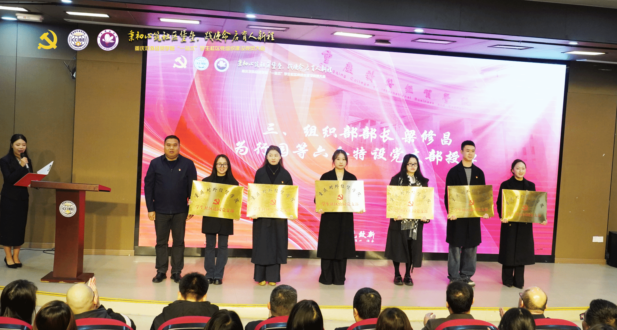 会议伊始,学工部部长伍祥伦作《“一站式”学生社区党组织建设专题报告》,系统阐述了相关工作进展与规划。随后,组织部部长梁修昌宣读了《关于同意学生社区行园党支部等6个特设党支部召开任期届满党支部党员大会和换届人选的批复》,并为各党支部现场授牌。谦园特设党支部学生党员代表周治慧作党员先锋岗承诺发言,达园特设党支部教师党员代表廖艳宣读《党建引领社区治理倡议书》。