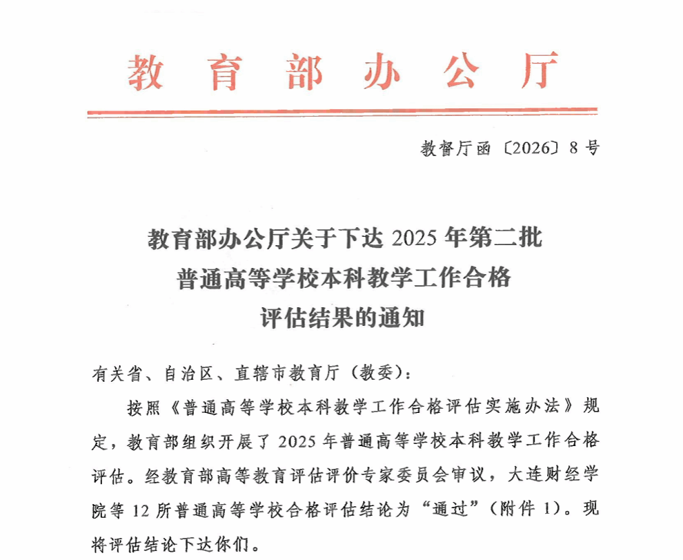 近日,教育部办公厅印发《关于下达2025年第二批普通高等学校本科教学工作合格评估结果的通知》(教督厅函〔2026〕8号)。根据专家组考察评估意见,经教育部高等教育评估评价专家委员会审议,36365官网本科教学工作合格评估的最终结论为“通过”。