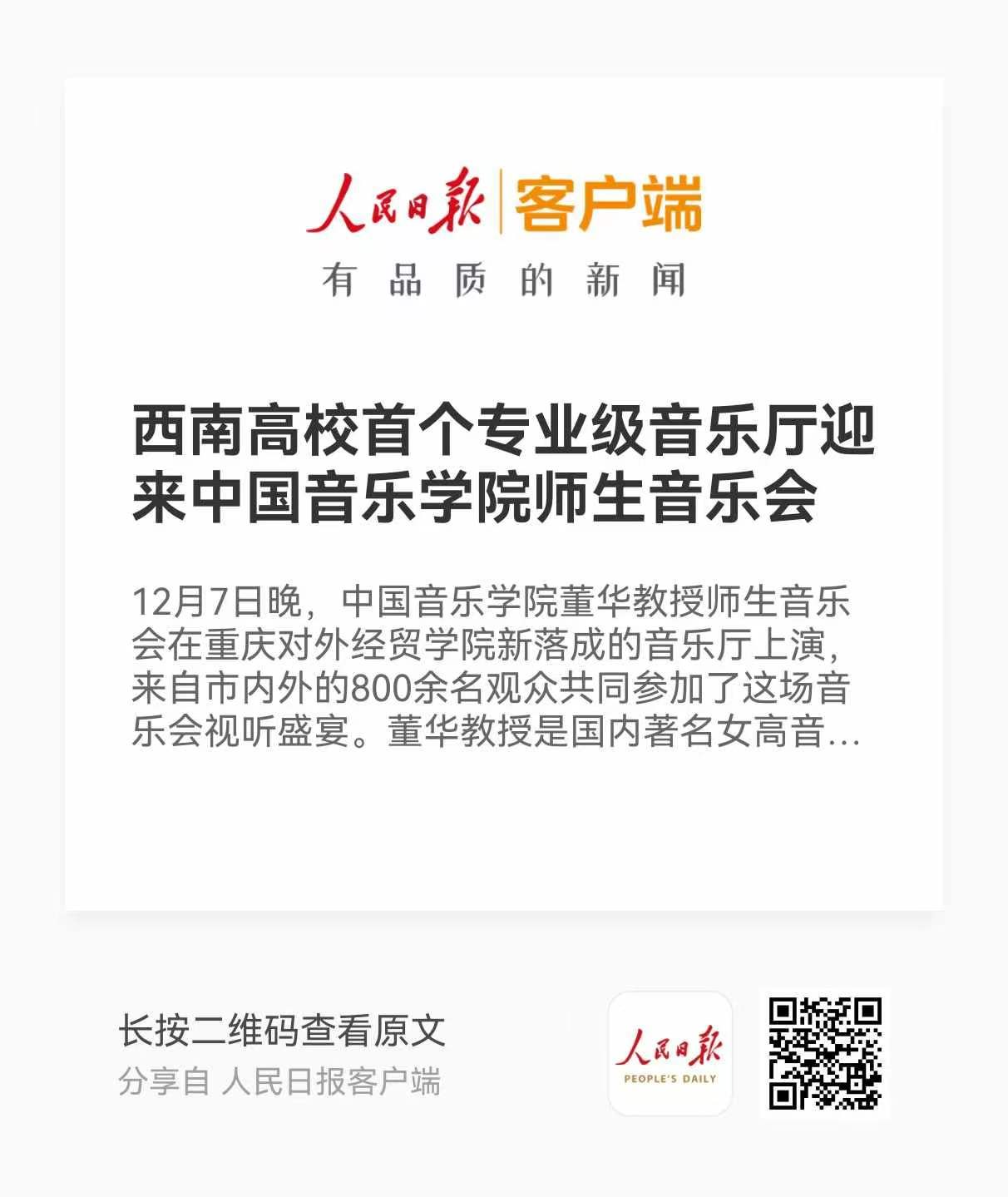 人民日报:《西南高校首个专业级音乐厅迎来中国音乐学院师生音乐会》