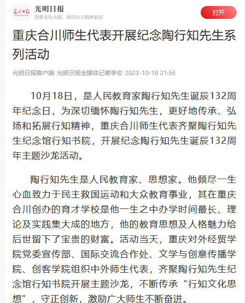 光明日报:《重庆合川师生代表开展纪念陶行知先生系列活动》