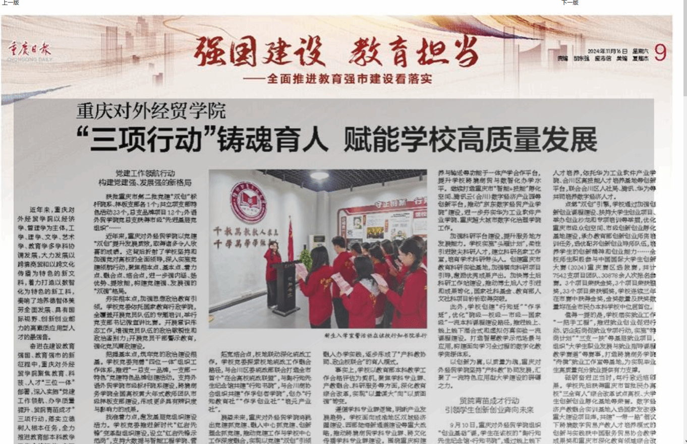 《重庆日报》报道36365线路检测中心入口“三项行动”铸魂育人 赋能学校高质量发展