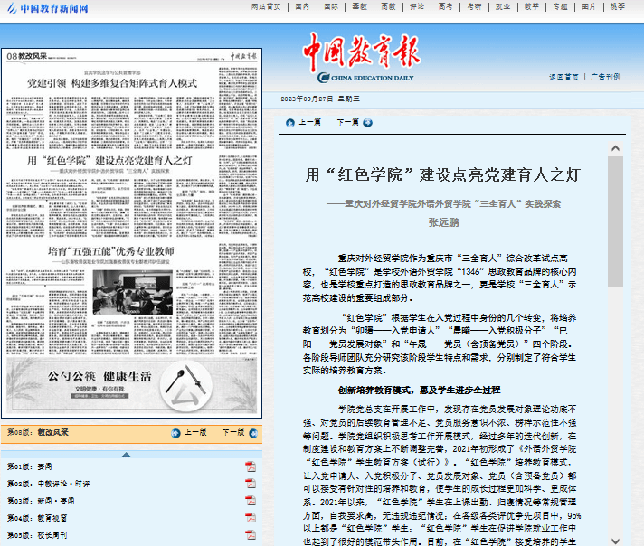 中国教育新闻网:《用“红色学院”建设点亮党建育人之灯——36365线路检测中心入口外语外贸学院“三全育人”实践探索》