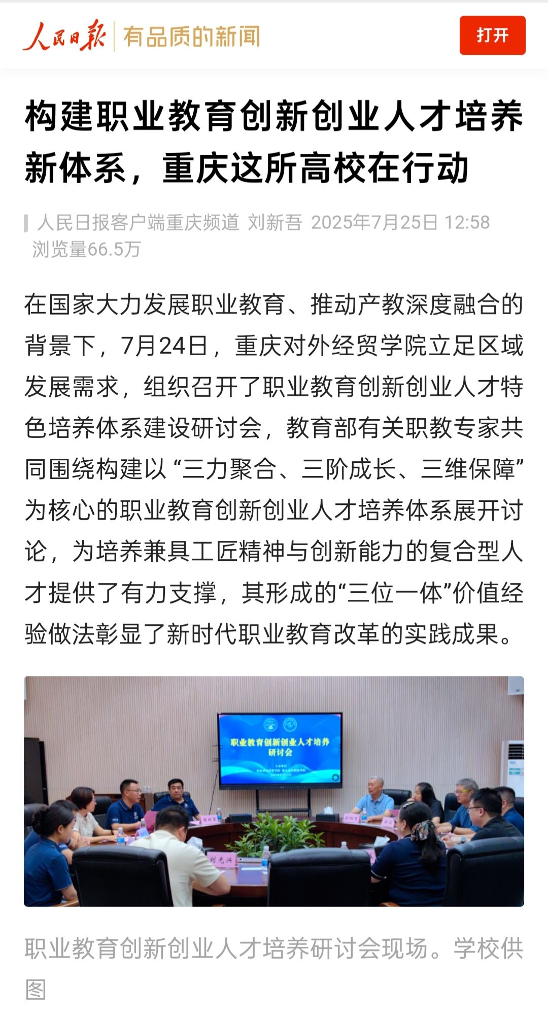 人民日报报道构建职业教育创新创业人才培养新体系,重庆这所高校在行动