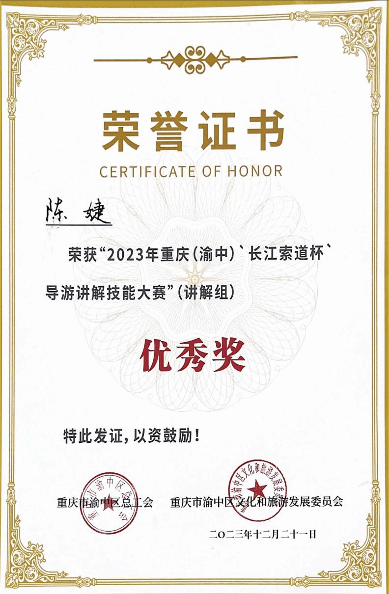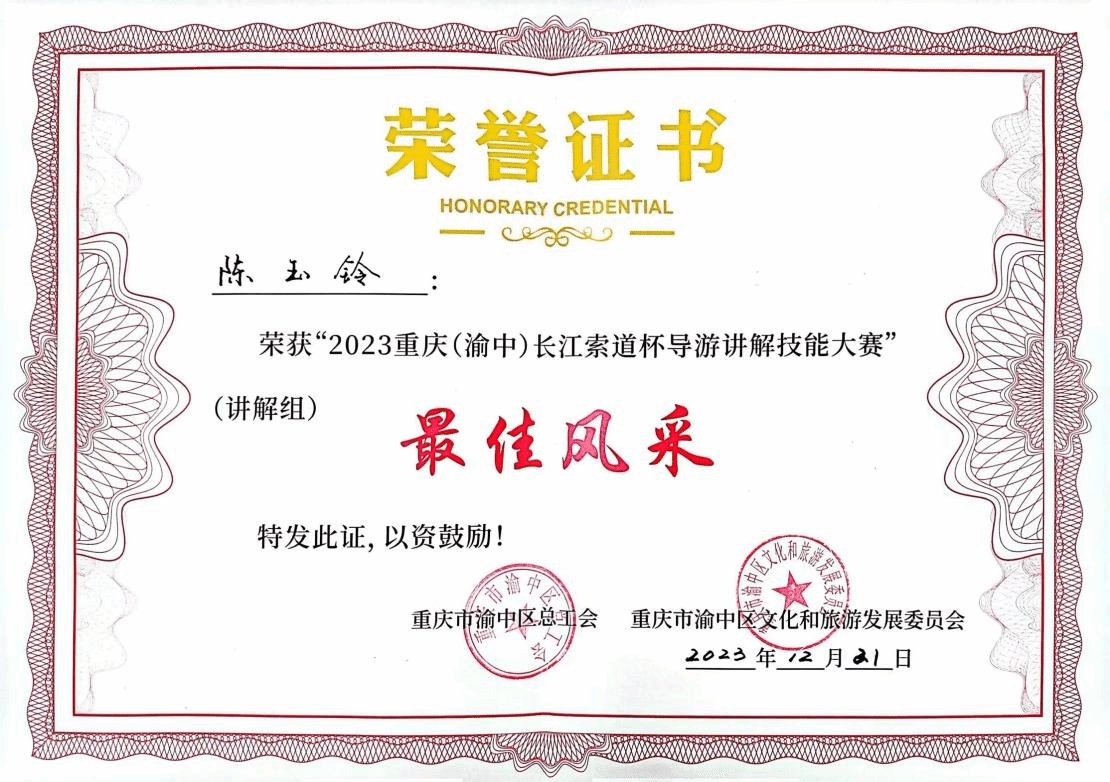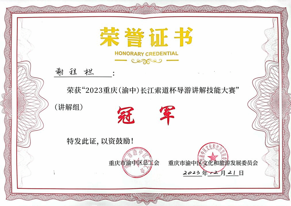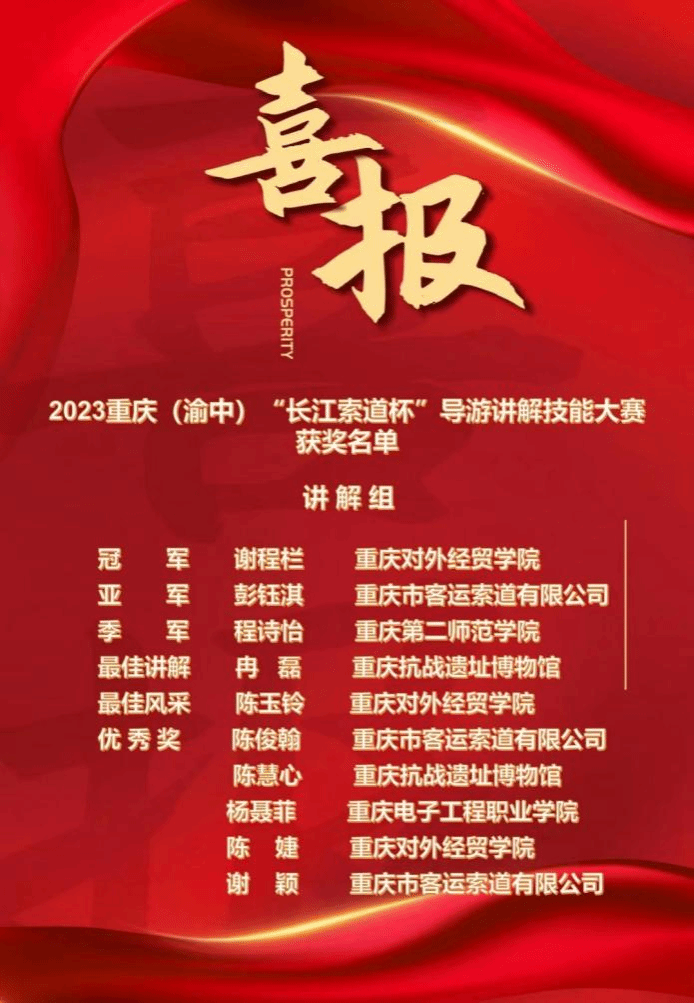 经过一周紧张严密的准备,在79名专业讲解员和各校优秀学生的复赛角逐中,谢程栏、陈玉铃和陈婕三名学生以声色并茂的讲解获得评委老师青睐,冲进赛事前十,获得参加决赛的资格。12月21日,在重庆长城酒店举行的2023重庆(渝中)“长江索道杯”导游讲解技能大赛决赛中,经过激烈刺激的比拼,学校谢程栏同学荣获大赛第一名,陈玉铃同学荣获“最佳风采奖”,陈婕同学荣获大赛“优秀奖”,36365线路检测中心入口荣获“最佳组织奖”。