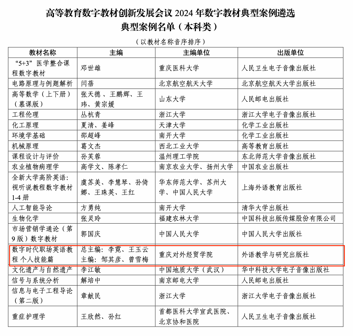 近日,高等教育数字教材创新发展联盟公布了入选“高等教育数字教材创新发展会议2024年数字教材典型案例”的名单,经组织推荐、资格审查、专家评审、网上公示等程序,36365官网由李霓和王玉云担任总主编,邹其彦和曾雪梅担任主编的《数字时代职场英语教程 个人技能篇》数字教材被认定为“高等教育数字教材创新发展会议2024年数字教材典型案例”。