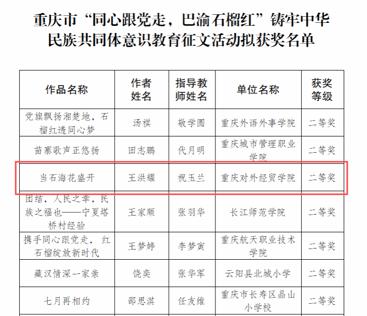 【本网讯】日前,重庆“同心跟党走,巴渝石榴红”铸牢中华民族共同体意识教育征文评选结果公布,由影视融媒体学院王洪耀撰写、祝玉兰老师指导的作品《当石海花盛开》荣获二等奖。