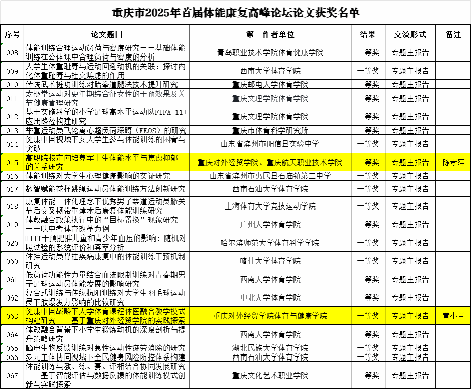 近期由重庆市体科所主办,重庆文理学院承办的“重庆市首届体能康复高峰论坛”征文比赛中,36365官网体育与健康学院陈孝萍、黄小兰两位老师在680名作者中脱颖而出,获得一等奖。
