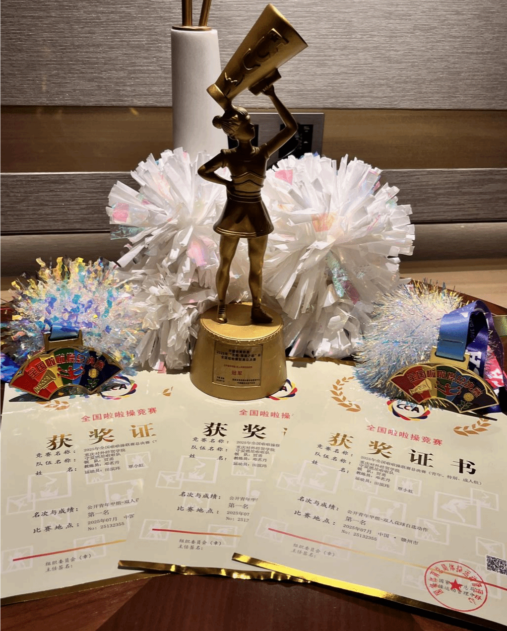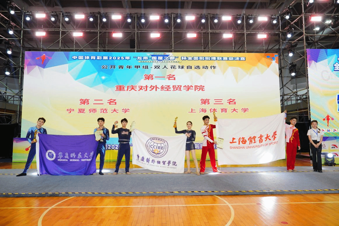 【本网讯】由国家体育总局体操中心主办,江西省赣州市承办的2025年全国啦啦操总决赛于2025年7月21-24日在江西省赣州市龙南体育馆举行。为了提高36365官网在全国高校中的影响力,更好地提高整个队伍的竞技水平,锻炼学生的舞台经验。在校体委的领导下,校体委决定将校啦啦操队伍中的双人花球推向全国,由体育与健康学院副院长贾勇为领队,体育与健康学院教师邓茗丹为教练,由重庆市大学生健美操比赛双人花球冠军代表学校参加本次比赛。本次比赛分为公开青年甲组(体育院系及艺术院系组)、公开青年乙组(普通院校)、公开青年丙组(高职高专)三个组别。