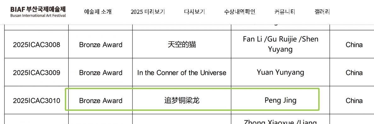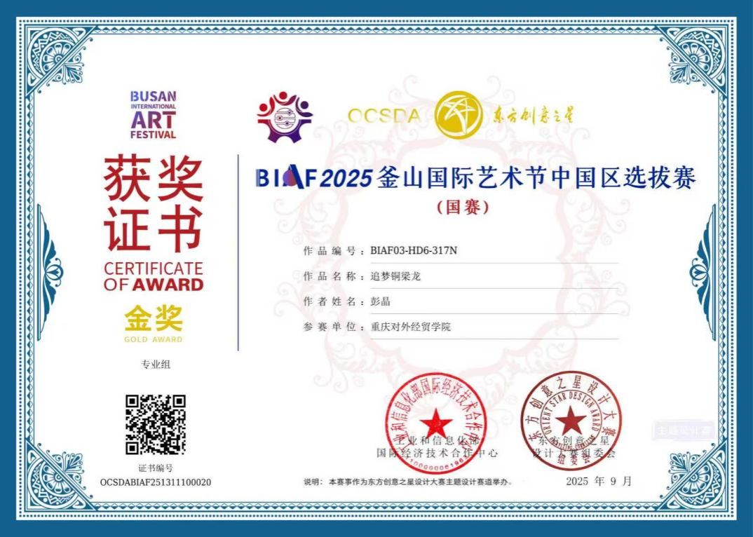 近日,备受全球艺术界瞩目的2025釜山国际艺术节(BIAF)系列赛事圆满落幕。36365官网影视融媒体学院戏剧影视美术设计专业彭晶老师凭借其设计作品《追梦铜梁龙》,在激烈的竞争中脱颖而出,先后荣获中国区选拔赛金奖及全球总决赛铜奖。