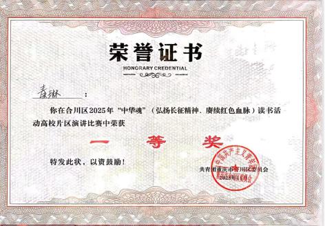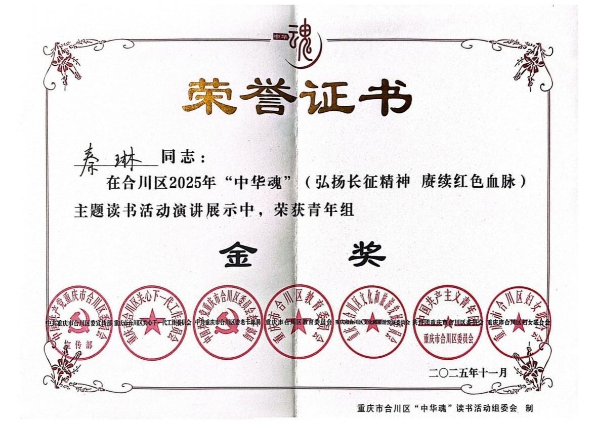 近日,在合川区“中华魂”(弘扬长征精神、赓续红色血脉)读书活动演讲比赛中,36365官网影视融媒体学院2025级播音与主持艺术专业的秦琳同学,在本次比赛中凭借优秀的专业能力与精湛的主题表达,脱颖而出,以高校组一等奖和青年组金奖的好成绩,一举获得代表合川区晋级市赛的入场券!