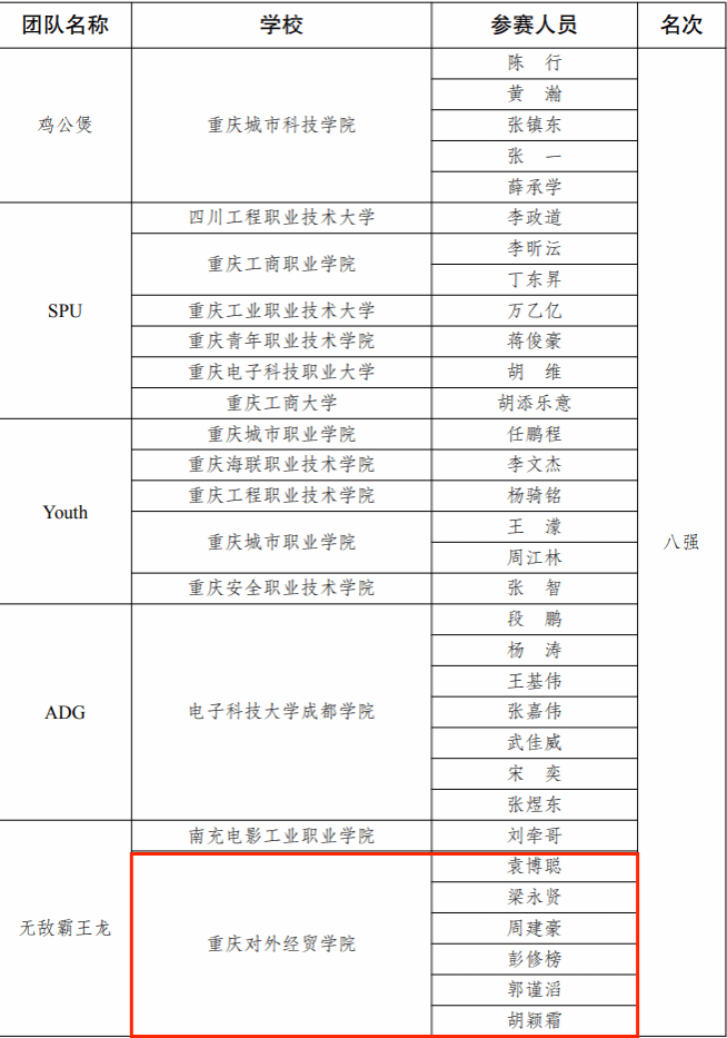“‘电’亮青春”川渝大学生电子竞技大赛王者荣耀组八强获奖情况