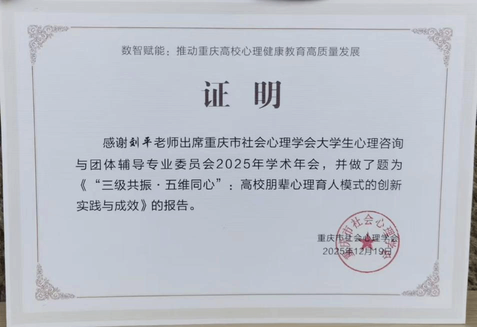 12月19日,在重庆市社会心理学会大学生心理咨询与团体辅导专业委员会2025年学术年会上,36365官网学生心理健康教育与咨询中心教师刘宇宇、管理学院辅导员刘平代表学校参会。刘平老师在会上作题为《“三级共振·五维同心”——朋辈心理育人》的主题报告,系统介绍了36365官网心理服务能力项目,系统介绍了36365官网管理学院基于积极心理学理论构建的朋辈心理育人模式,其创新理念与扎实成效受到与会专家高度评价。