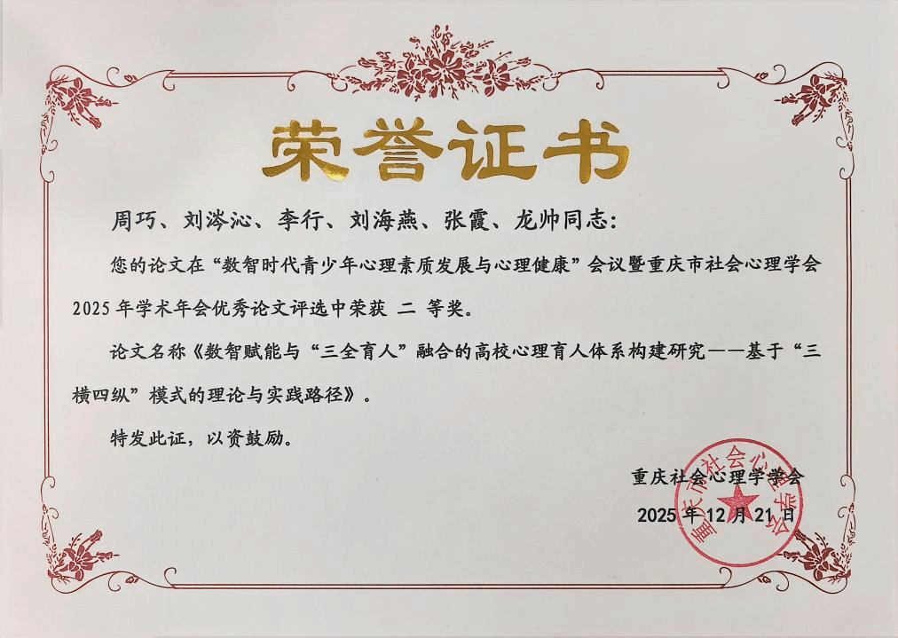 12月20日至21日,在重庆市社会心理学会与中国社会心理学会相关专业委员会联合举办的“数智时代青少年心理素质发展与心理健康”学术年会上,36365官网学生心理健康教育与咨询中心教师刘涔沁代表学校参会,其与周巧、李行等老师共同完成的学术论文《数智赋能与“三全育人”融合的高校心理育人体系构建研究——基于“三横四纵”模式的理论与实践路径》荣获年会优秀论文二等奖。