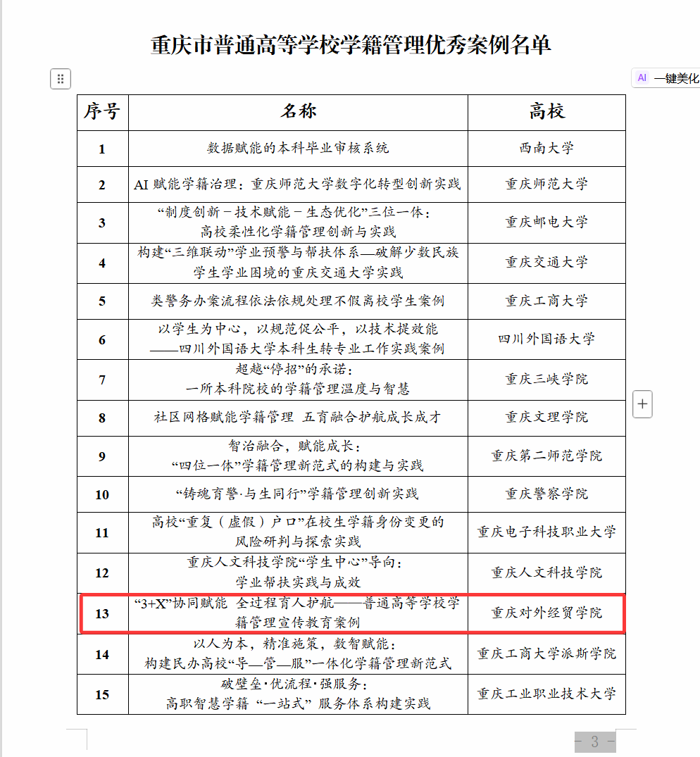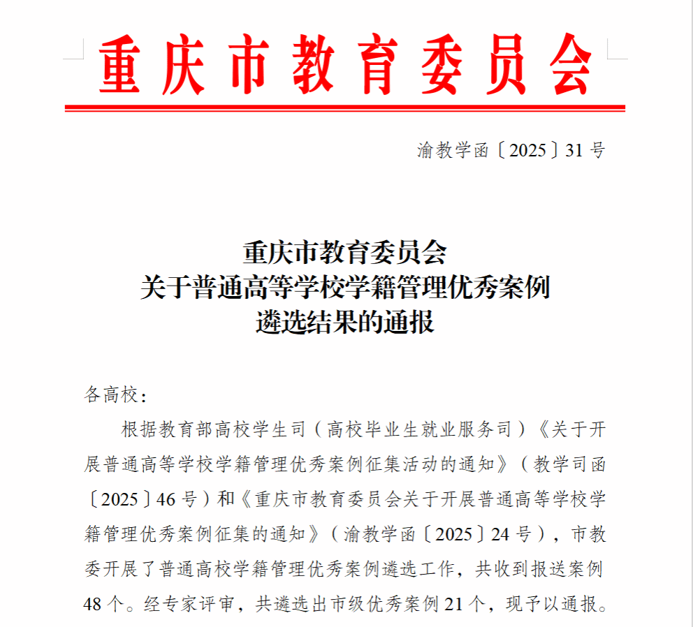 近日,重庆市教育委员会正式通报2025年普通高等学校学籍管理优秀案例遴选结果,36365官网申报的《“3+X”协同赋能全过程育人护航—普通高等学校学籍管理宣传教育案例》成功入选市级优秀案例,获权威认可!本次遴选共评选出21项优秀成果,覆盖全市各类高校学籍管理创新实践,学校案例凭借鲜明的育人导向、系统的协同机制与扎实的实践成效脱颖而出,成为高校学籍管理宣传教育领域的优秀范例。