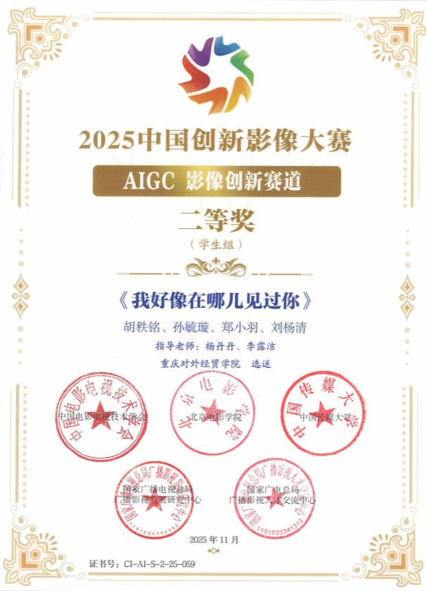 【本网讯】近日,由中国电影电视技术学会、北京电影学院、中国传媒大学、国家广电总局发展研究中心、国家广电总局广播影视人才交流中心共同主办的2025年中国创新影像大赛正式公布获奖名录。影视融媒体学院师生团队携丝绸之路题材AIGC短片作品《我好像在哪儿见过你》出征。在激烈角逐中,该团队凭借扎实的专业功底、新颖的创作视角与突出的创新实践能力,最终荣获大赛AIGC影像创新赛道学生组全国“二等奖”,为学校赢得了荣誉!