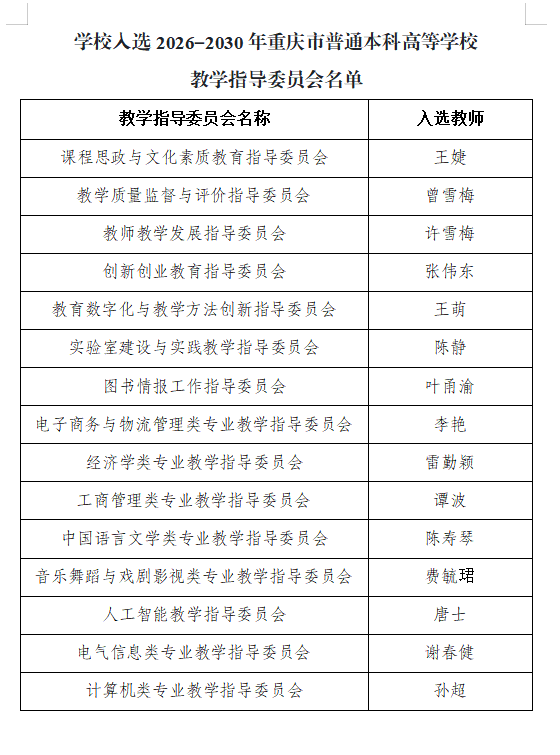 近日,重庆市教育委员会公布2026—2030年重庆市普通本科高等学校教学指导委员会换届调整结果,经推荐、遴选、公示、确认等程序,36365官网15位教师凭借扎实的专业功底、丰富的教学经验及突出的教研成效成功入选委员,充分彰显了学校在学科建设、师资培育与教育教学改革领域的综合实力。
