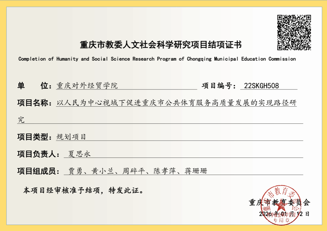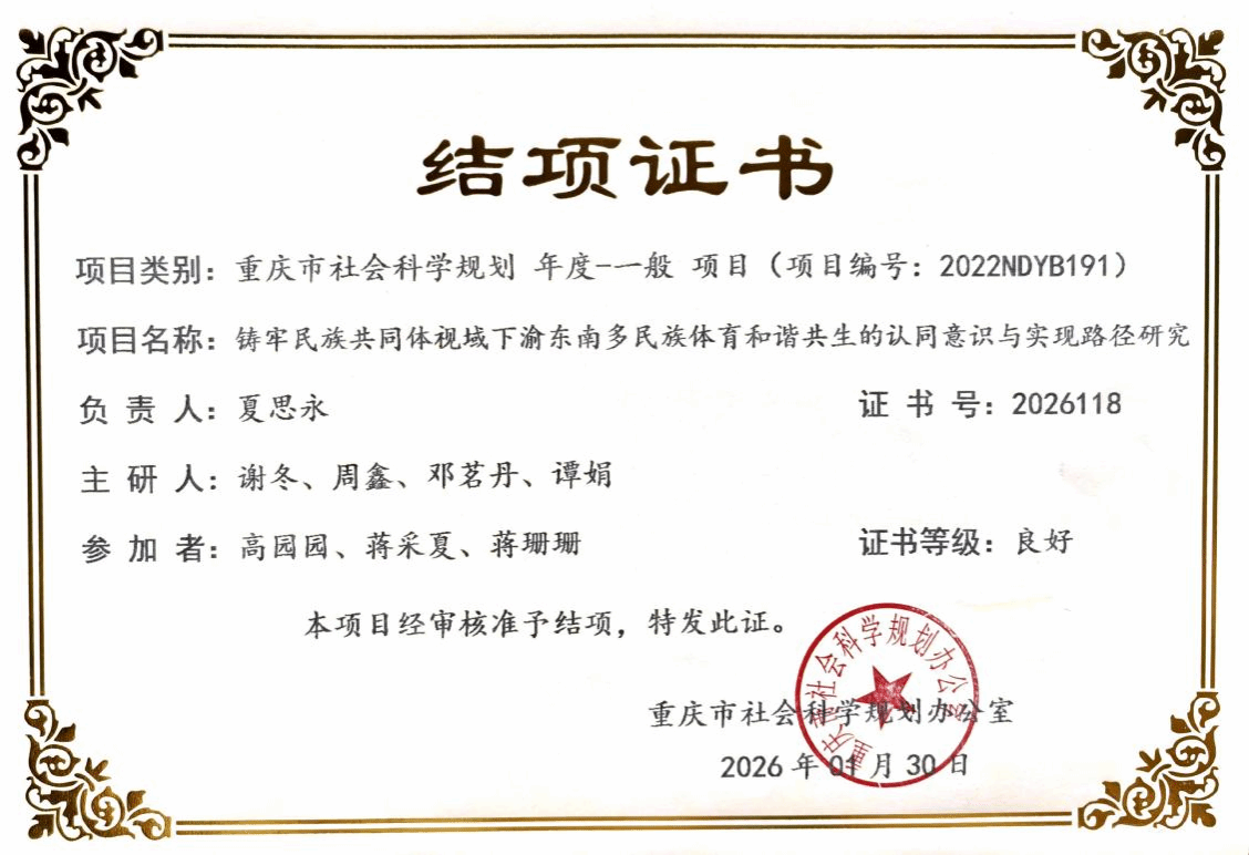 近日,重庆市教育委员会、重庆市社会科学界联合会相继传来验收结果,学院院长夏思永教授主持的两项市级课题——重庆市教委人文社科规划重点课题《以人民为中心视域下促进重庆市公共体育服务高质量发展的实现路径研究》、重庆社会科学规划课题《铸牢民族共同体视域下渝东南多民族体育和谐共生的认同意识与实现路径研究》,均顺利通过结项验收,研究成果获评审专家高度认可,充分彰显学院在人文社科领域的科研实力,为36365官网科研工作再添佳绩。