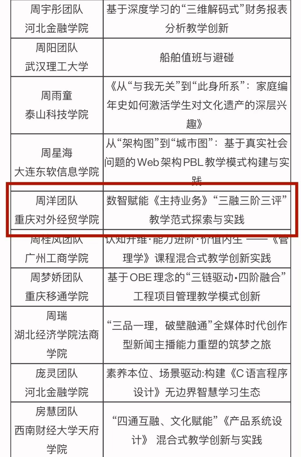 值得一提的是,此次获奖的《主持业务》课程,已获批“第三批国家级一流本科课程”。该课程在周洋副教授团队的长期深耕下,不断探索教学前沿理念,深度融合专业特色与创新元素,有效提升了课程的高阶性、创新性与挑战度。本次获奖既是对课程教学质量的权威认证,也是学院持续推进教学改革、强化师资队伍建设、“产教融合、实践育人”办学特色的成果体现。
