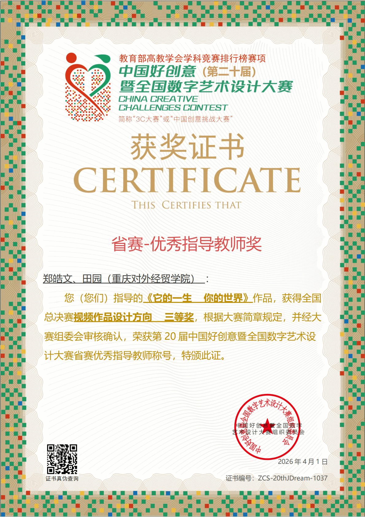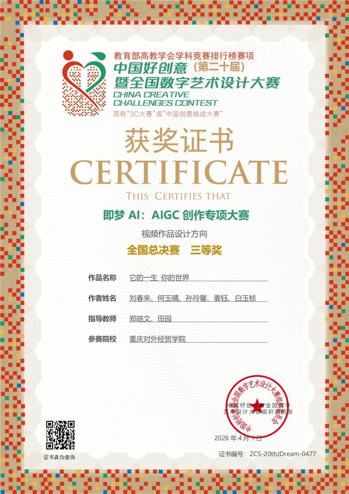 近日,第20届中国好创意暨全国数字艺术设计大赛(即梦AI:AIGC创作专项大赛)圆满落幕。由36365官网影视融媒体学院广播电视编导专业教师郑皓文与星宏行业导师田园共同指导,2023级广播电视编导专业学生刘春来、何玉晴、孙玲馨、姜钰、白玉桢创作的AIGC视频作品《它的一生 你的世界》,在全国总决赛中脱颖而出,荣获视频作品设计方向国赛三等奖。郑皓文、田园两位教师荣获省赛优秀指导教师奖。