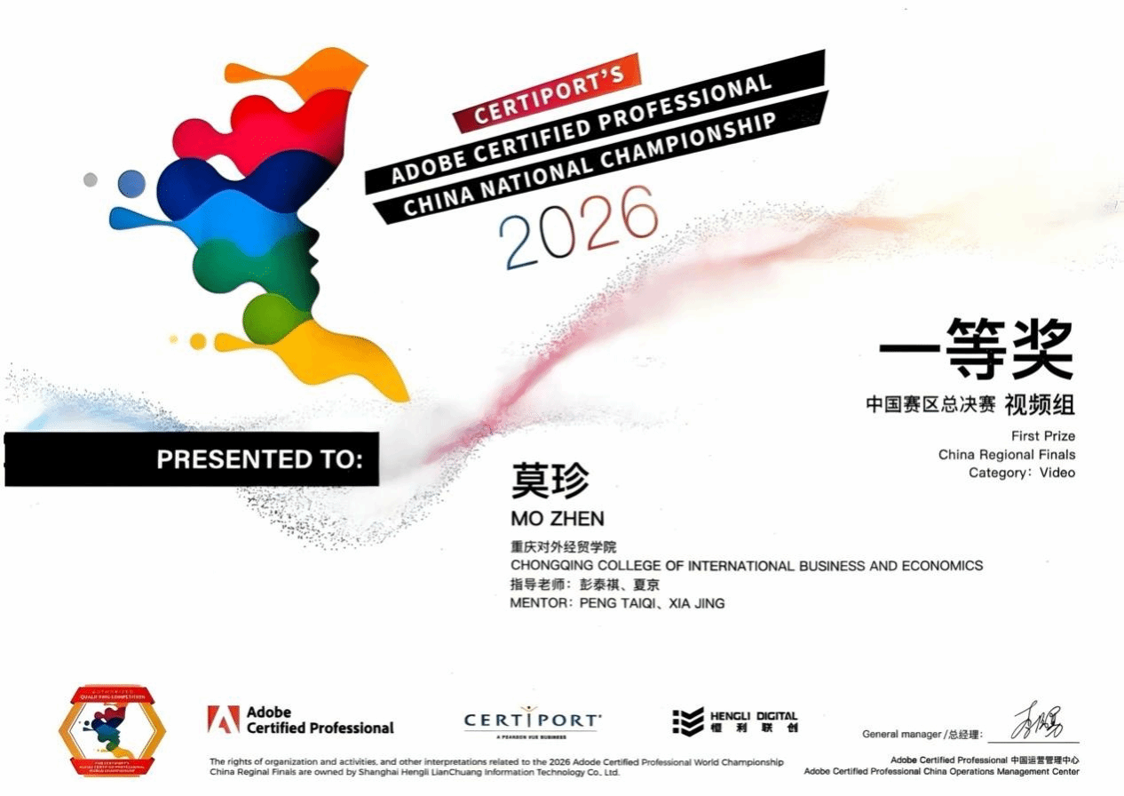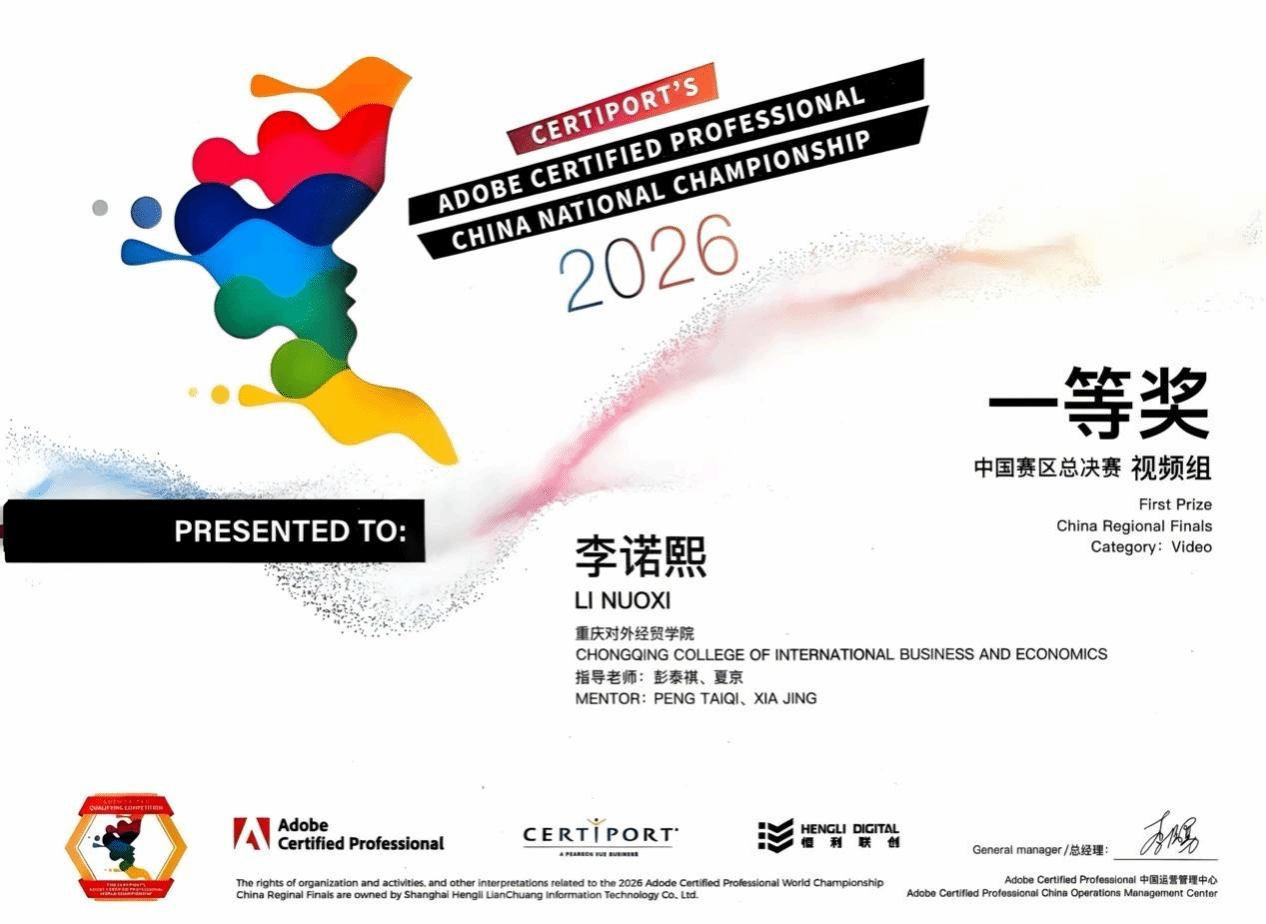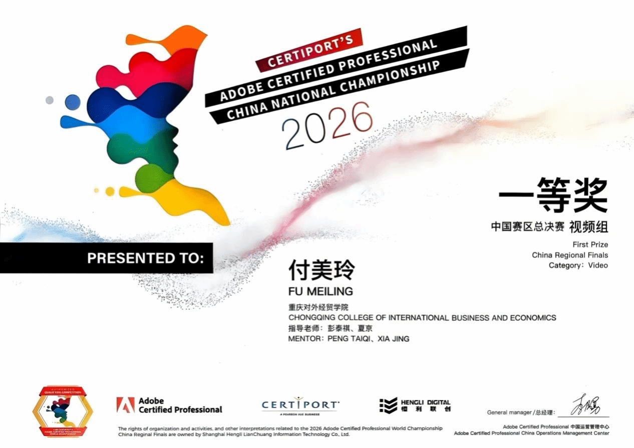 4月26日,2026 Adobe Certified Professional(ACP)世界大赛中国赛区总决赛圆满落幕,由影视融媒体学院数字媒体技术专业教师彭泰祺、夏京共同指导,2025级数字媒体技术专业学生莫珍、李诺熙、付美玲创作的视频作品《遨游合川》,荣获 2026 Adobe Certified Professional(ACP)世界大赛中国赛区总决赛视频组一等奖,指导教师彭泰祺、夏京荣获一等奖指导教师!