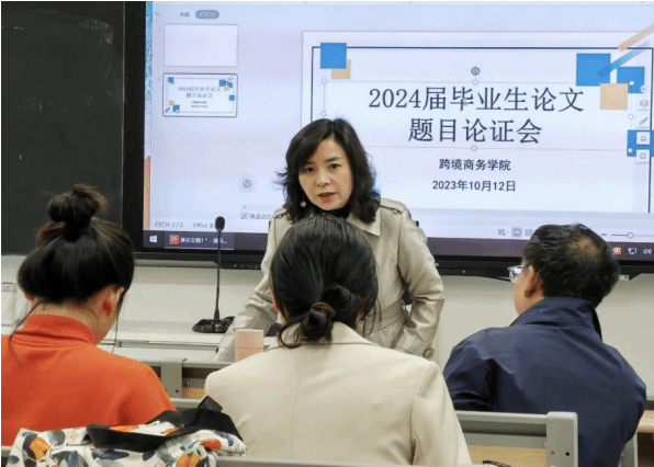 2023年10月12日下午,跨境商务学院组织全体教师开展了“2024届毕业生论文选题论证会”。此次论证会以专业为单位开展,由各专业负责人组织,学院全体任课教师参与。