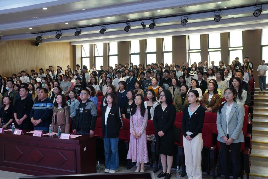 首先,活动开始,全体起立,齐唱《国际歌》,随后党总支组织员刘坤奇同志宣读新发展党员批复,并由学院院长、党总支纪检委员赵逖同志为新发展党员代表佩戴党徽。