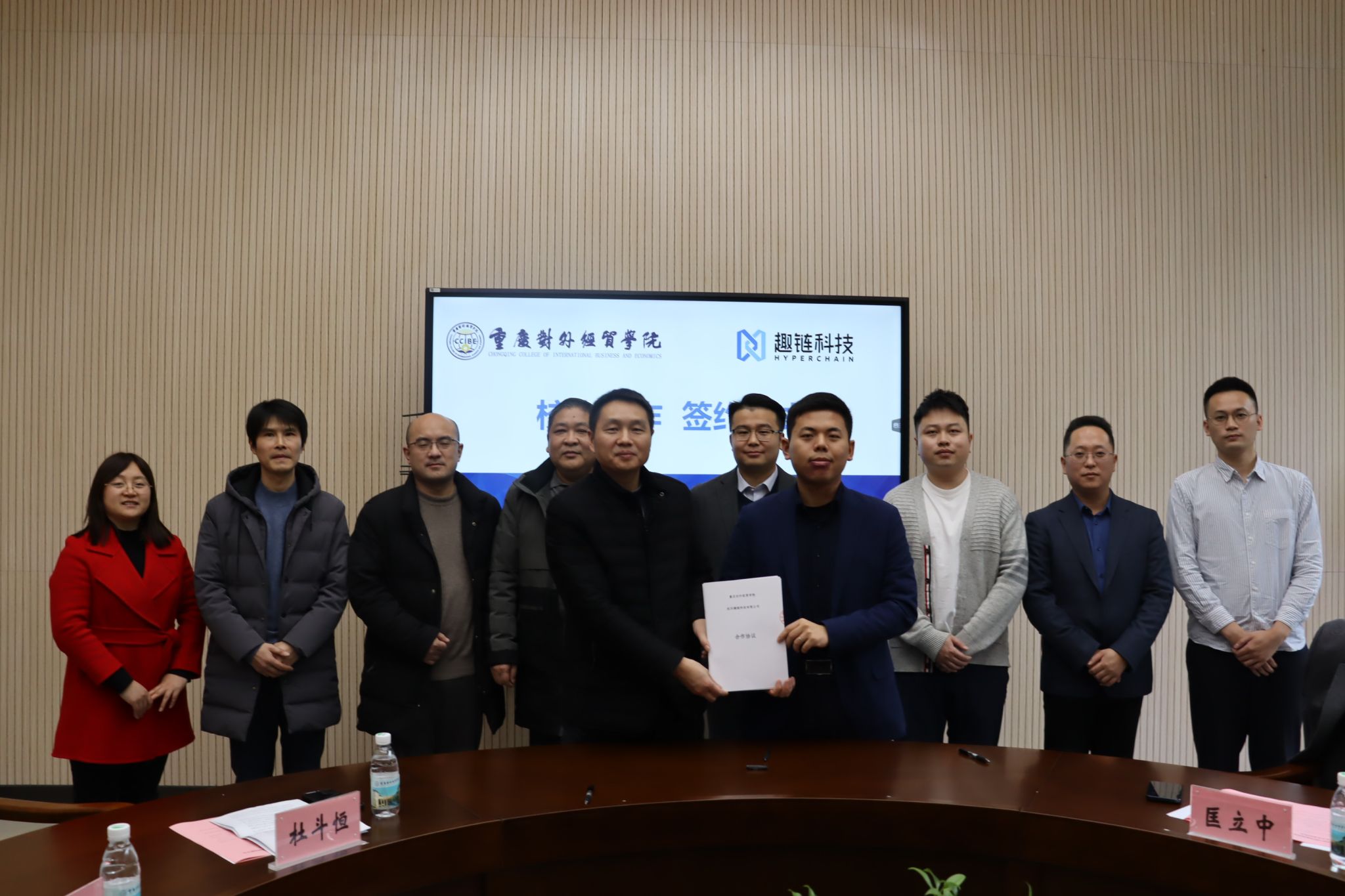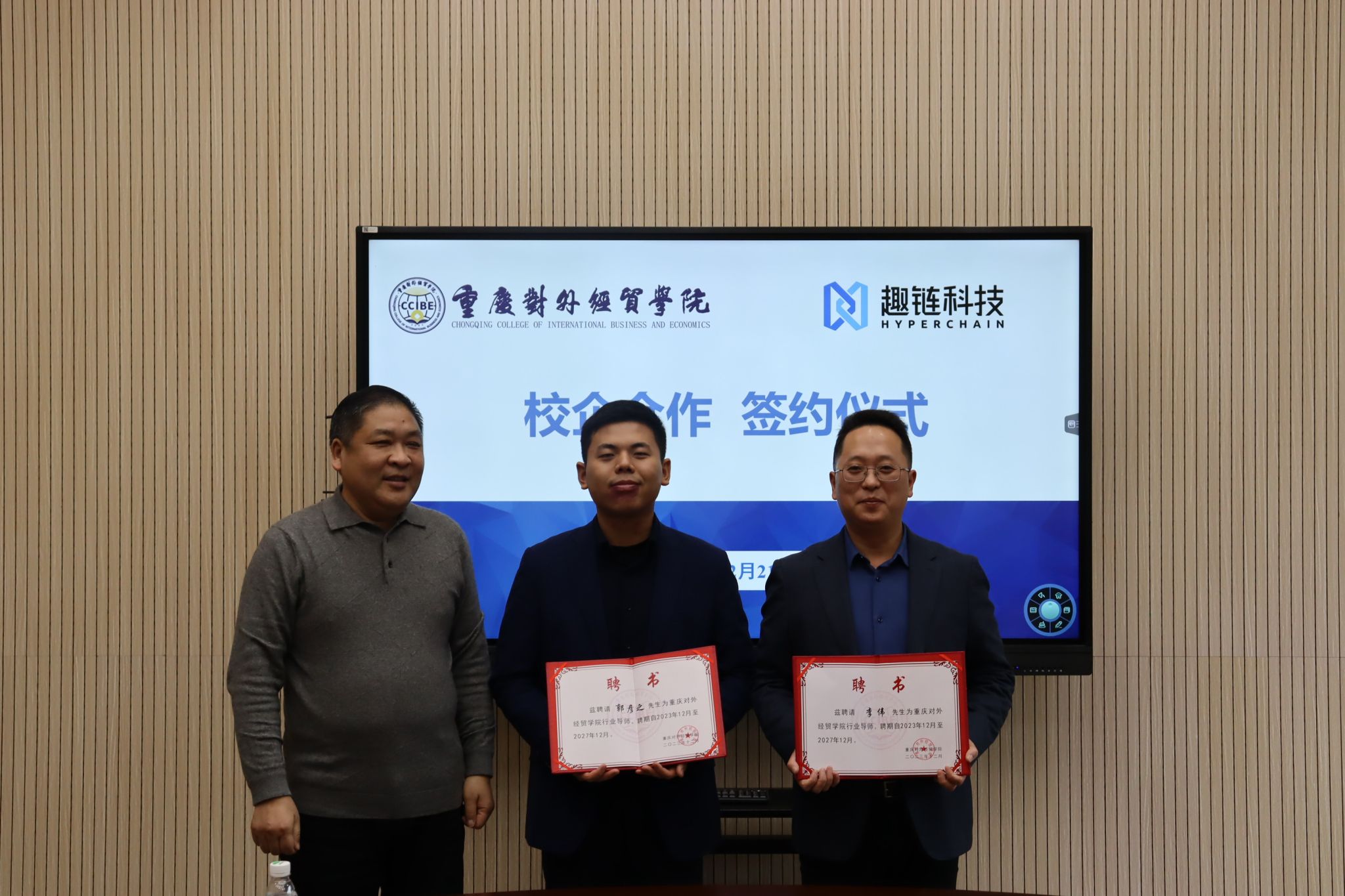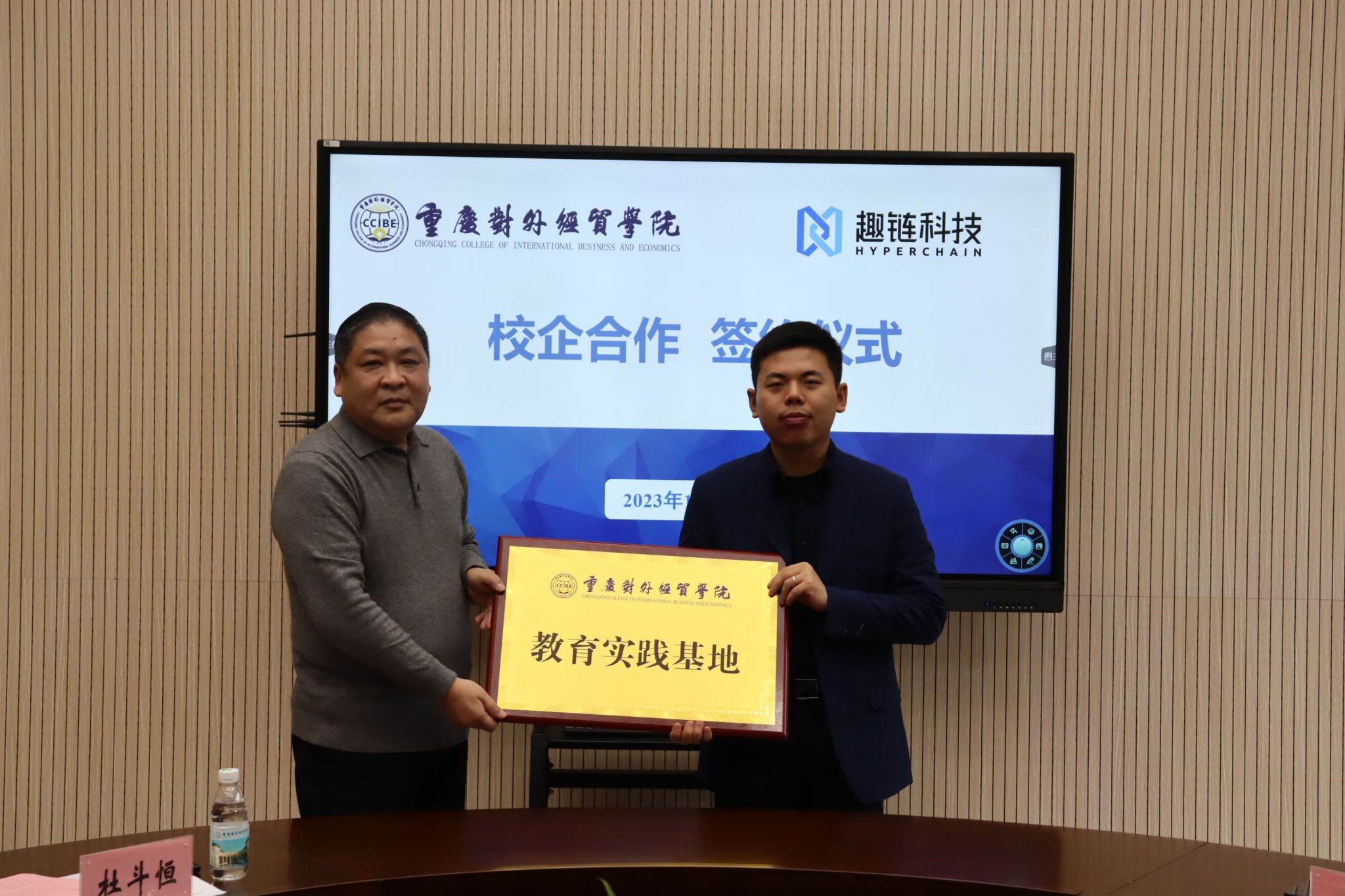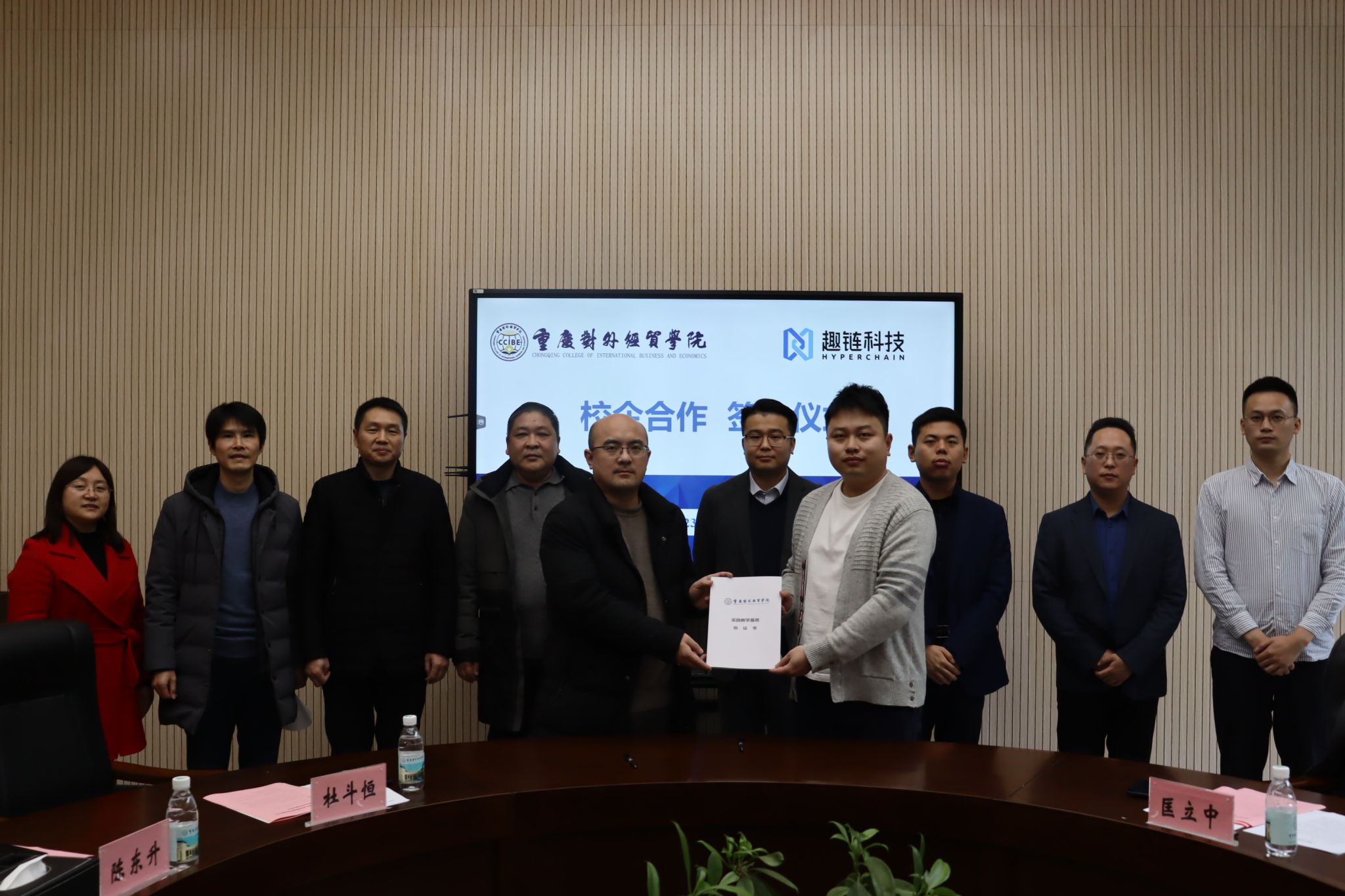 随后,双方代表分别签署了校企合作协议、实践教学基地合作协议;同时,杜校长为杭州趣链科技有限公司授予实践教学基地牌匾,并为各位行业导师依次颁发了聘书。