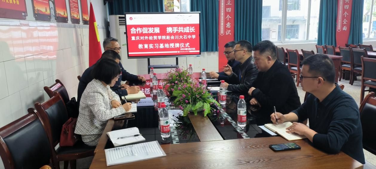 会议由重庆市合川大石中学纪委书记李富强主持,重庆市合川大石中学党委书记吴仁翔、校长张建桥以及教务处主任杜斌出席会议。首先吴书记对大石中学的办学历史、师资,办学成果,办学理念,办学特色、校园文化建设等进行了详细的介绍,“石”是这所学校的文化载体、精神基石,渗透着教育的温度与情怀,学校将“大行致广,石以载道”作为办学理念,着力打造以石头文化为特色的校园文化。吴书记表示,实习基地的建立,双方在教学实践、教育科研、传承创新等方面均能实现双赢和提升,他希望未来双方能充分发挥各自的优势,在人才培养、教育教改、师资培训各方面深化合作,实现高等教育和基础教育的融合发展。