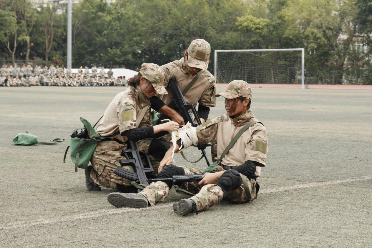 “指挥组收到!火力掩护,迅速抢救伤员!”接到命令,同学们迅速跑到伤员位置,正确判断伤情,准确定位,进行有效止血包扎,本次战地救护表演同学们对手部、腿部炸伤的伤员进行实战演练。