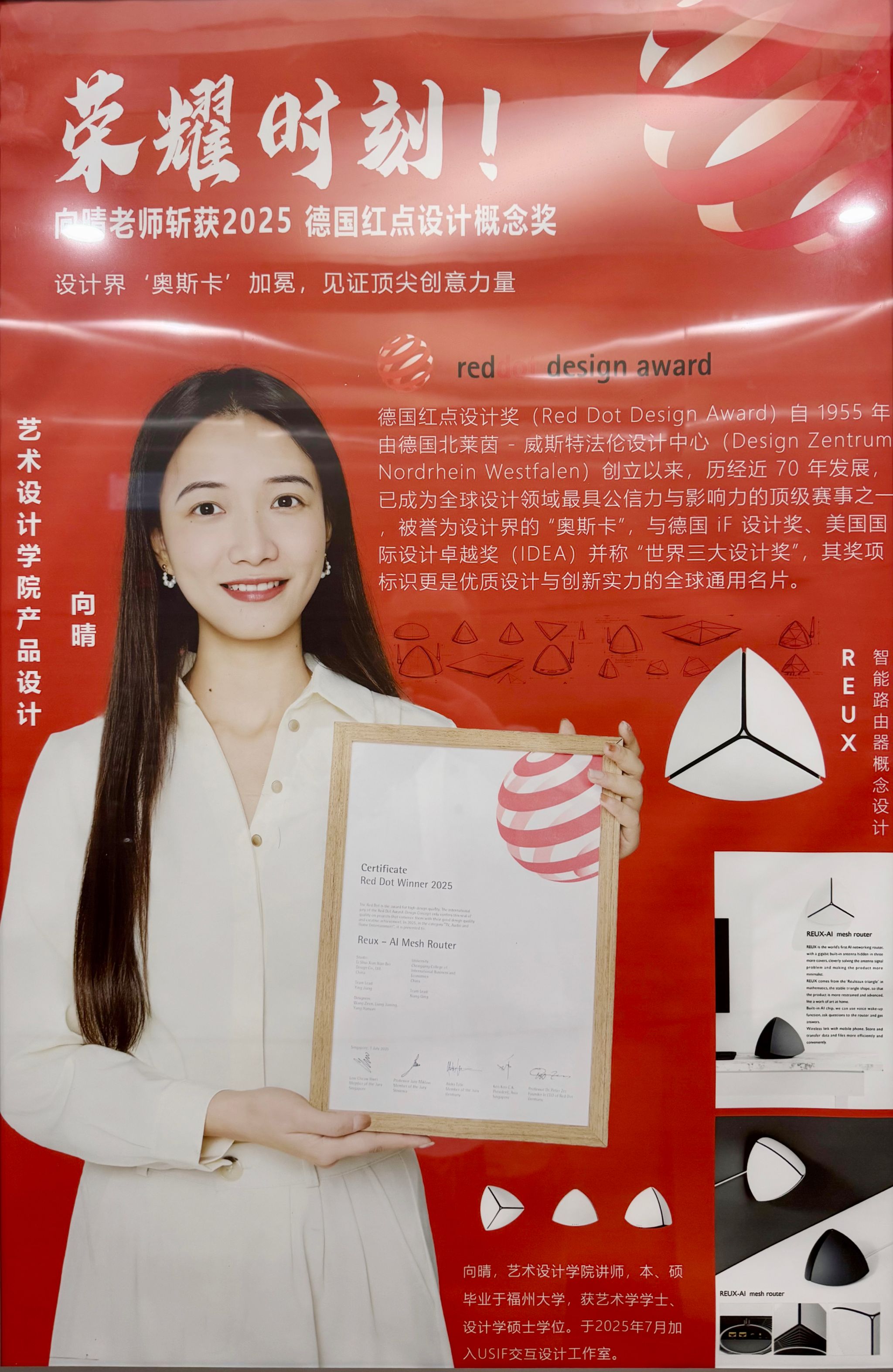 2025年8月向晴教师团队设计"Reux-AlMeshRouter"智能路由器作品通过层层选拔,在全球5万余件作品中脱颖而出,以优异成绩获得全球最具影响力的知名设计竞赛——“红点设计”概念奖。