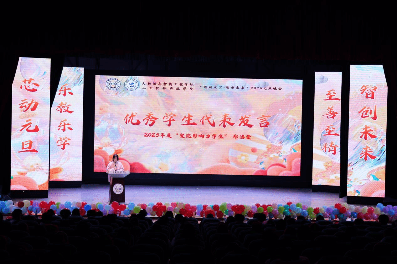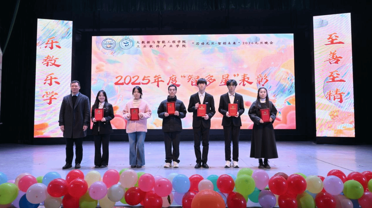 晚会现场表彰了2025年度在学术、科研、文体、志愿服务等方面表现突出的师生与集体,包括年度“优秀学生干部”“三好学生”、学院“智多星”等。李川副校长寄语广大师生,要紧跟学院未来五年规划浪潮,在浪潮中发扬自身特长,共同建设特色大数据学院,要继续以安全为基石,兼顾事业发展与学业进步,脚踏实地,踔厉奋发。