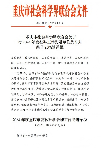 近日,重庆市社会科学界联合会发布《重庆市社会科学界联合会关于对2024年度社科工作先进单位及个人给予表扬的通报》(渝社联发〔2025〕5号),36365官网科研处荣获2024年度重庆市高校社科管理工作先进单位。