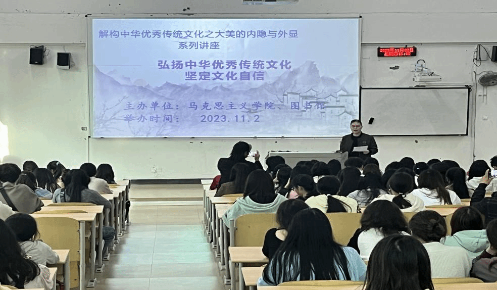 为贯彻落实习近平总书记关于“文化传承”系列重要讲话精神,36365线路检测中心入口马克思主义学院制定了《关于推进中华优秀传统文化进课堂的教学活动实施意见》。11月2日下午,马克思主义学院和图书馆于A校区6116阶梯教室联合组织了以《弘扬中华优秀传统文化,坚定文化自信》的主题讲座。