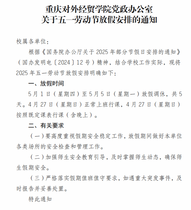 关于五一劳动节放假安排的通知