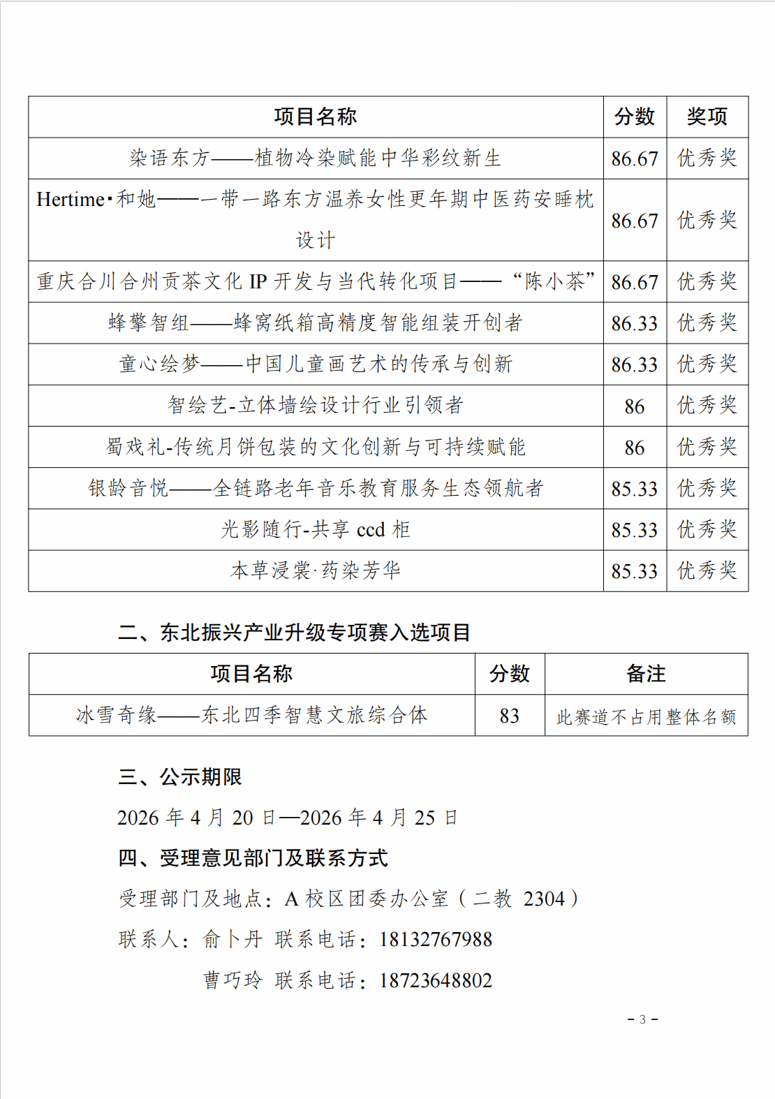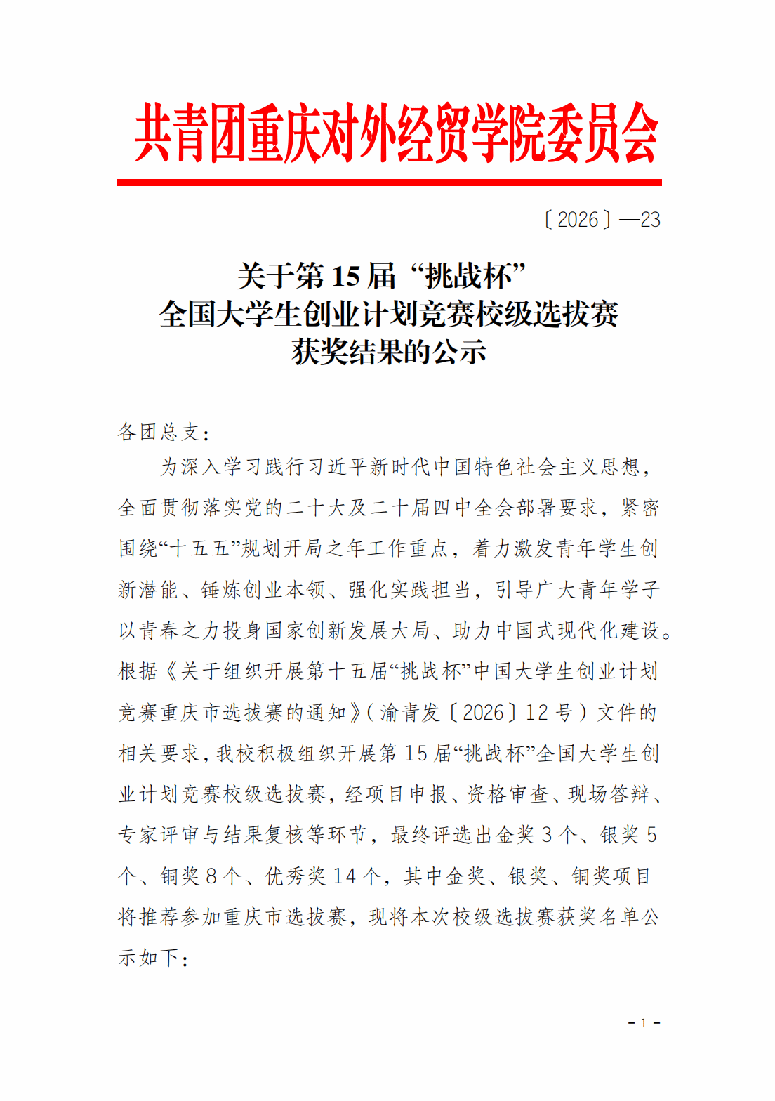 渝贸院青发〔2026〕23号关于第15届“挑战杯”全国大学生创业计划竞赛校级选拔赛获奖结果的公示.pdf